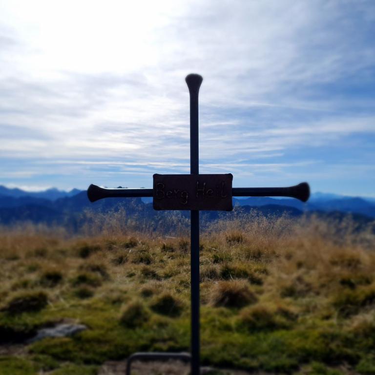 Nach ca. 20 Minuten zügigem Aufstieg erreicht man auch diesen schönen Aussichtsgipfel mit hölzernem Gipfelkreuz.