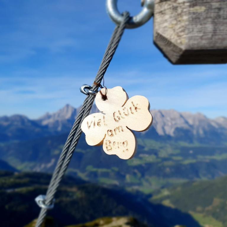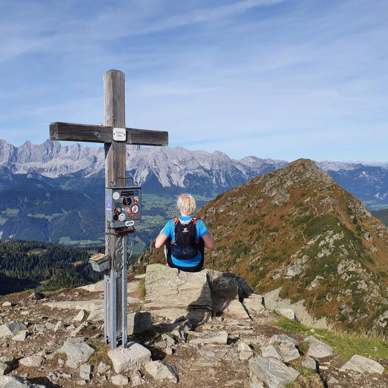 Der Rundumblick ist genial, vor allem zum Dachstein auf der gegenüberliegenden Seite. Eine Brotzeitbank lädt zum Verweilen ein.