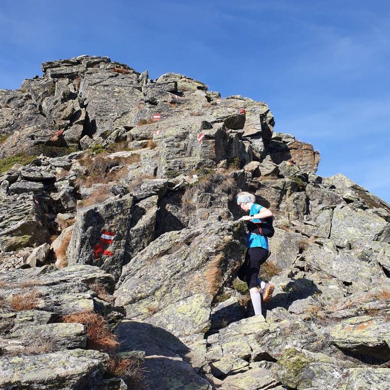 Auf dem Bergkamm geht es wellig weiter. Links sieht man den Schober-Gipfel und geradeaus kann man nach einiger Zeit das nächste Gipfelziel, den Rippeteg 2126 m erkennen. Bei einem kleinen Gipfelkreuz zwischen Gasselhöhe und Rippetegg ist der Ausstieg des kurzen "Franzi"-Klettersteigs, den wir am Tag darauf durchsteigen werden. Der Trail bietet sehr viel Abwechslung. Ein auf und ab, auch eine Leiter muss überwunden werden.