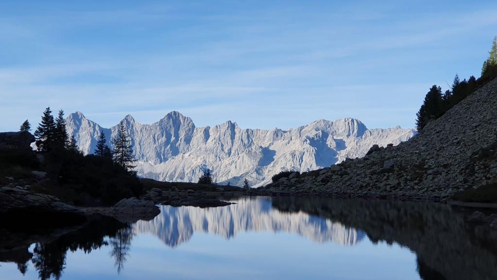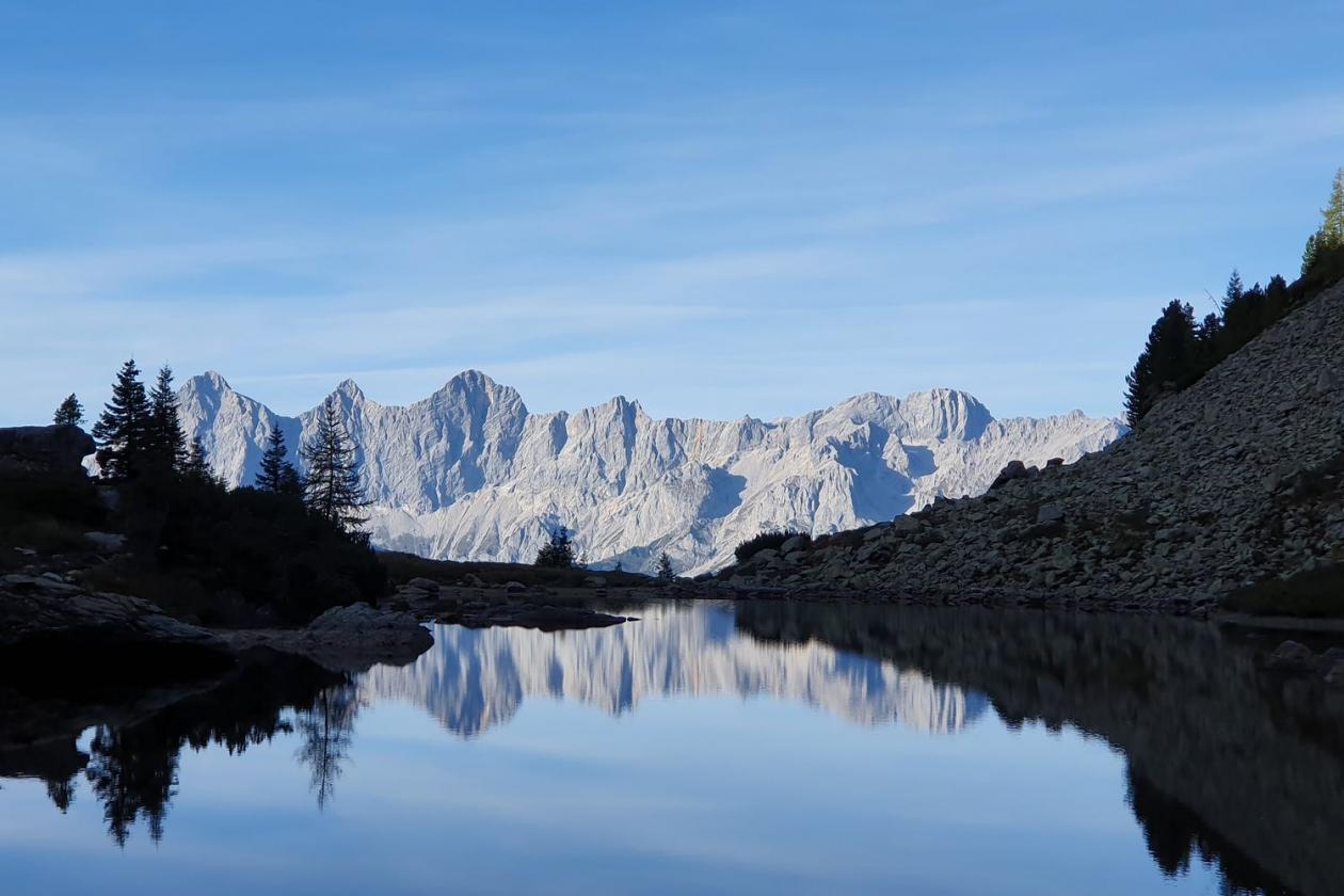 Nach ein paar Minuten erreicht man auch schon den idyllisch gelegenen Spiegelsee. Den Namen hat der kleine See nicht zu Unrecht, da sich das Dachstein Gebirge sensationell darin spiegelt. Hier kann man schon einmal für ein paar Minuten die Seele baumeln und den tollen Blick auf sich wirken lassen. Natürlich mit der Voraussetzung das nicht zu viele Wanderer unterwegs sind.