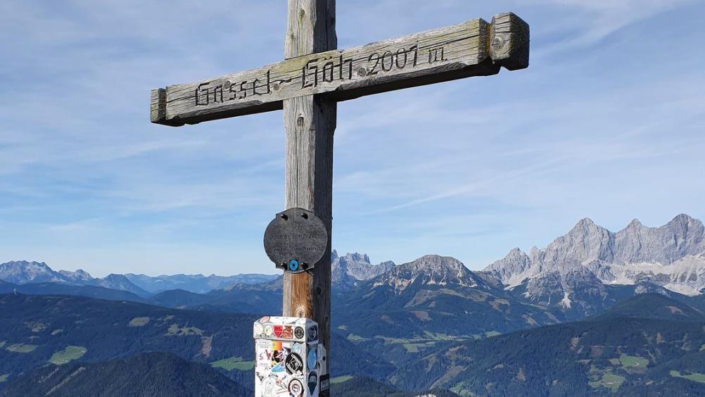 Von hier sieht man schon die Almbar, die sicherlich im Winter gut besucht ist und wo die ein oder andere Apre-Ski Party gefeiert wird. Man folgt einem kleinen Pfad bergan. Der Wegweiser zeigt schon den nächsten Gipfel, die Gasselhöhe mit 2001 m. Ab jetzt wandert man auf dem Reiteralm Höhenweg, der über die Gasselhöhe und Rippetegg führt.