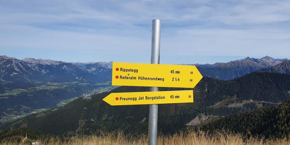 Das Ganze kann man entschärfen, wenn an der Bergstation Preunegg Jet oder Parkplatz Reiteralm gestartet wird und man den Schober nicht besteigt. Der Reiteralm Höhenrundweg kommt auf 450 Höhenmeter und 5,5 km.