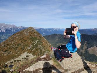 Auf dem Bergkamm geht es wellig weiter. Links sieht man den Schober-Gipfel und geradeaus kann man nach einiger Zeit das nächste Gipfelziel, den Rippeteg 2126 m erkennen. Bei einem kleinen Gipfelkreuz zwischen Gasselhöhe und Rippetegg ist der Ausstieg des kurzen "Franzi"-Klettersteigs, den wir am Tag darauf durchsteigen werden. Der Trail bietet sehr viel Abwechslung. Ein auf und ab, auch eine Leiter muss überwunden werden.