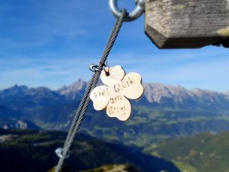 Der Rundumblick ist genial, vor allem zum Dachstein auf der gegenüberliegenden Seite. Eine Brotzeitbank lädt zum Verweilen ein.