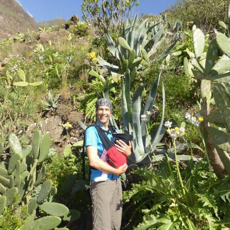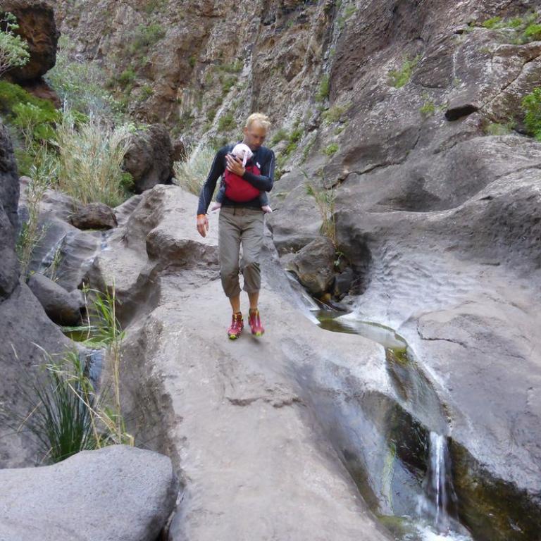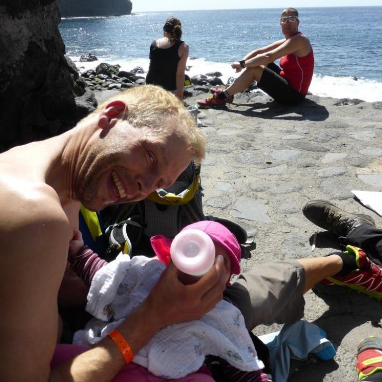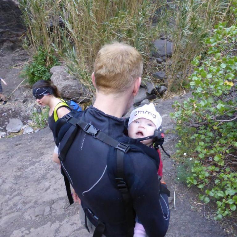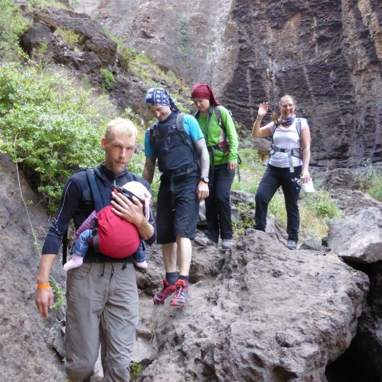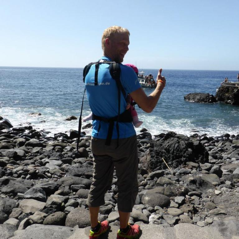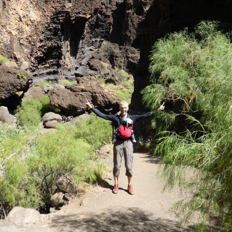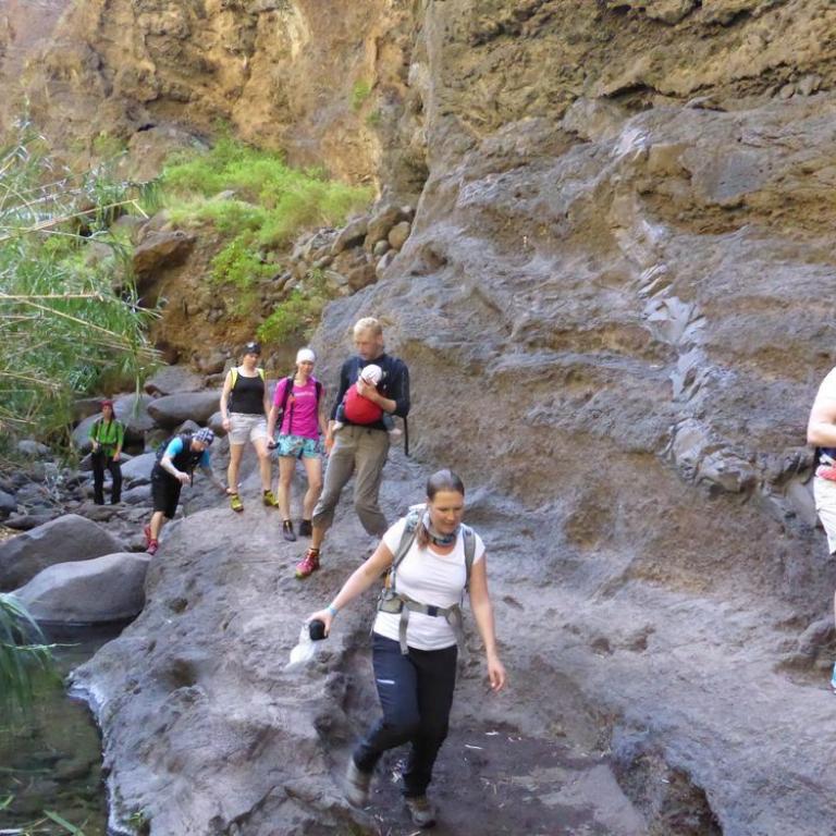 Nach dem Frühstück ging es auch gleich wieder los zur nächsten Tour. Am trainingsfreien Tag fuhren wir in verschiedenen Gruppen mit dem Mietauto zur ca. 45 min entfernt gelegenen Masca Schlucht. Die meisten starteten die Wanderung in Masca auf ca. 500 Hm, um in die Schlucht ab zu steigen und wieder zurück zu wandern. Ein paar fuhren von Los Gigantes mit dem Schiff in die Mascabucht und stiegen nur auf. Um ca. 10 Uhr ging es, nach einer kleinen Brotzeit für Emma, bei herrlichem Wetter in die traumhafte Mascaschlucht. Unsere Gruppe bestand aus Jupp, Andrea, Kathrin, Christoph mit Johanna in der Trage, Gaby und Eva und natürlich Brigitte und mir mit Emma vorne in der Trage. Zuerst wanderten wir auf einfachen Pfaden steil nach unten. Blühende Kakteen standen links und rechts von uns. Die Vegetation ist hier einzigartig. Langsam wurde der Trail schwieriger. Immer wieder mussten wir über Felsen steigen, was mit Emma vorne drin gar nicht zu einfach war und absolute Trittsicherheit von mir erforderte. Auch kleine Wasserlöcher und Felsspalten mussten wir überwinden. Der Wind zeigte sich manchmal von seiner rauen Seite und blies uns ins Gesicht. Die Felswände ragen imposant an beiden Seiten empor und man fühlt sich so richtig klein. Unsere Emma, wie auch die kleine Johanna waren begeistert von der Tour und schauten fasziniert die Gegend an, bevor sie nach halber Strecke wieder den Schlaf der Gerechten fanden. Nach knapp 3 Stunden und vielen Klettereinlagen, die mit Baby an Bord gar nicht so einfach waren, erreichten wir den Masca Strand, wo wir uns in die Sonne legten. Die kleinen Mädels bekamen ihr Mittagessen und durften sich recken und strecken. Wir genossen die Aussicht und starteten nach der Pause wieder den Aufstieg zum Ausgangspunkt. Hier hatten wir großes Glück, da ein Felsen herab sauste, aber keinen traf. Jeder war etwas geschockt, aber nach ein paar Metern in der traumhaften Schlucht war wieder alles vergessen. Der Weg von unten nach oben sah wieder komplett anders aus und verlieh wieder neue Reize. Auch für den Aufstieg benötigten wir wieder fast 3 Stunden. In Masca machten wir noch kurz Rast und genehmigten uns ein kühles Getränk, bevor wieder die kurvige Strecke zurück zum Hotel mit dem Auto fuhren. Das leckere Abendessen hatten wir uns auch heute wieder verdient.