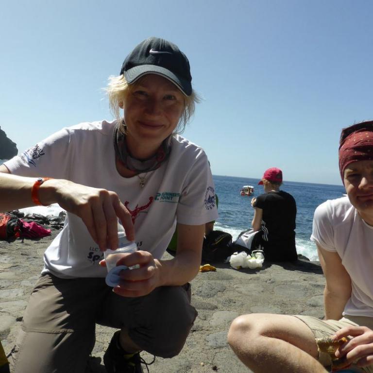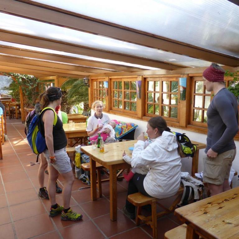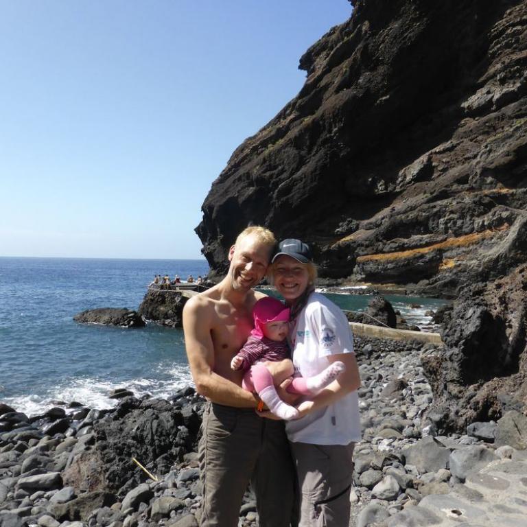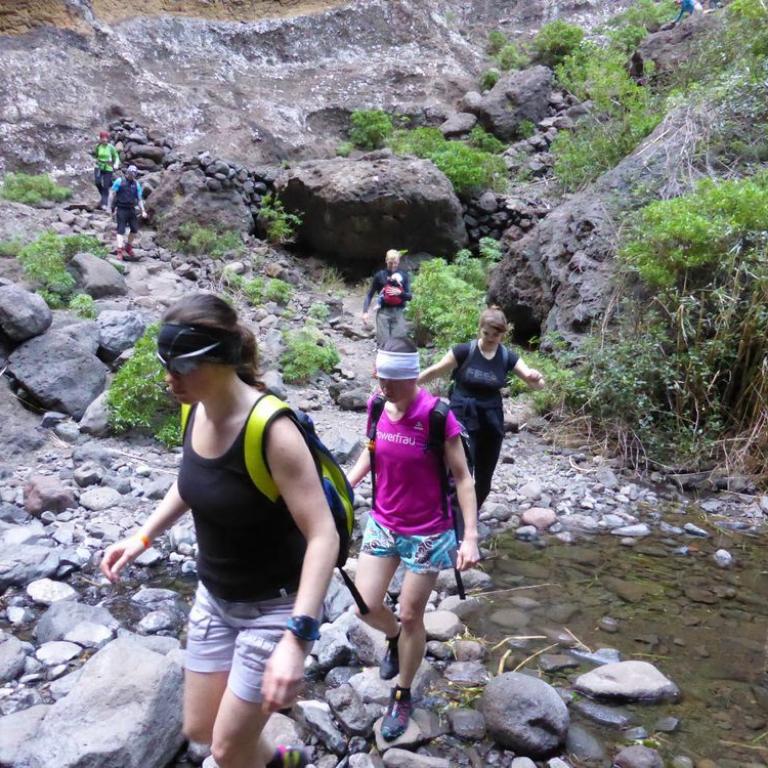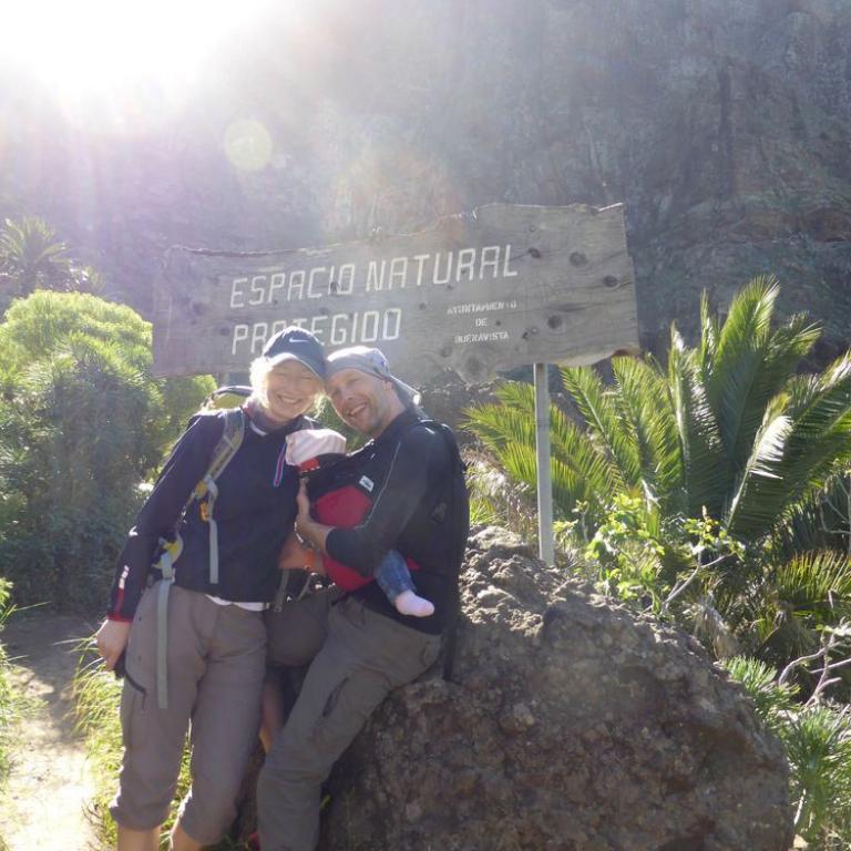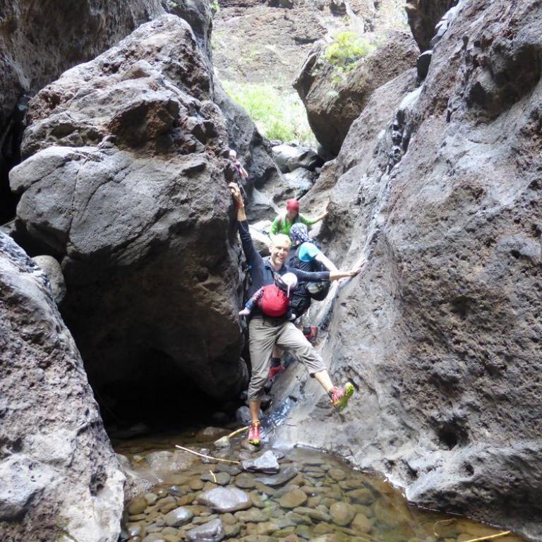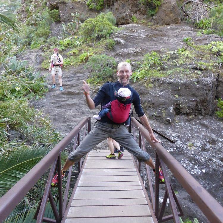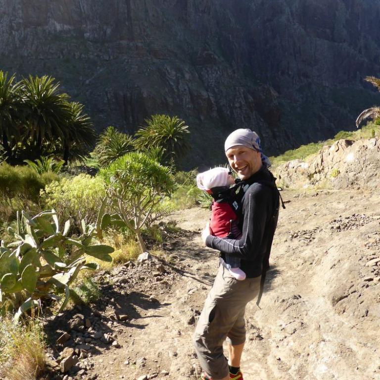 Nach dem Frühstück ging es auch gleich wieder los zur nächsten Tour. Am trainingsfreien Tag fuhren wir in verschiedenen Gruppen mit dem Mietauto zur ca. 45 min entfernt gelegenen Masca Schlucht. Die meisten starteten die Wanderung in Masca auf ca. 500 Hm, um in die Schlucht ab zu steigen und wieder zurück zu wandern. Ein paar fuhren von Los Gigantes mit dem Schiff in die Mascabucht und stiegen nur auf. Um ca. 10 Uhr ging es, nach einer kleinen Brotzeit für Emma, bei herrlichem Wetter in die traumhafte Mascaschlucht. Unsere Gruppe bestand aus Jupp, Andrea, Kathrin, Christoph mit Johanna in der Trage, Gaby und Eva und natürlich Brigitte und mir mit Emma vorne in der Trage. Zuerst wanderten wir auf einfachen Pfaden steil nach unten. Blühende Kakteen standen links und rechts von uns. Die Vegetation ist hier einzigartig. Langsam wurde der Trail schwieriger. Immer wieder mussten wir über Felsen steigen, was mit Emma vorne drin gar nicht zu einfach war und absolute Trittsicherheit von mir erforderte. Auch kleine Wasserlöcher und Felsspalten mussten wir überwinden. Der Wind zeigte sich manchmal von seiner rauen Seite und blies uns ins Gesicht. Die Felswände ragen imposant an beiden Seiten empor und man fühlt sich so richtig klein. Unsere Emma, wie auch die kleine Johanna waren begeistert von der Tour und schauten fasziniert die Gegend an, bevor sie nach halber Strecke wieder den Schlaf der Gerechten fanden. Nach knapp 3 Stunden und vielen Klettereinlagen, die mit Baby an Bord gar nicht so einfach waren, erreichten wir den Masca Strand, wo wir uns in die Sonne legten. Die kleinen Mädels bekamen ihr Mittagessen und durften sich recken und strecken. Wir genossen die Aussicht und starteten nach der Pause wieder den Aufstieg zum Ausgangspunkt. Hier hatten wir großes Glück, da ein Felsen herab sauste, aber keinen traf. Jeder war etwas geschockt, aber nach ein paar Metern in der traumhaften Schlucht war wieder alles vergessen. Der Weg von unten nach oben sah wieder komplett anders aus und verlieh wieder neue Reize. Auch für den Aufstieg benötigten wir wieder fast 3 Stunden. In Masca machten wir noch kurz Rast und genehmigten uns ein kühles Getränk, bevor wieder die kurvige Strecke zurück zum Hotel mit dem Auto fuhren. Das leckere Abendessen hatten wir uns auch heute wieder verdient.