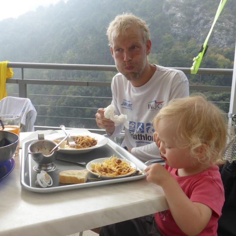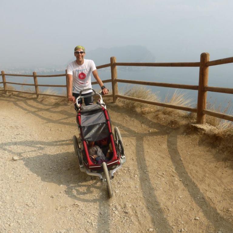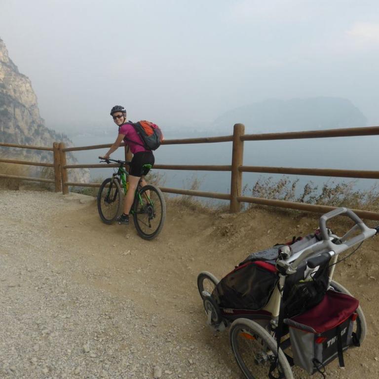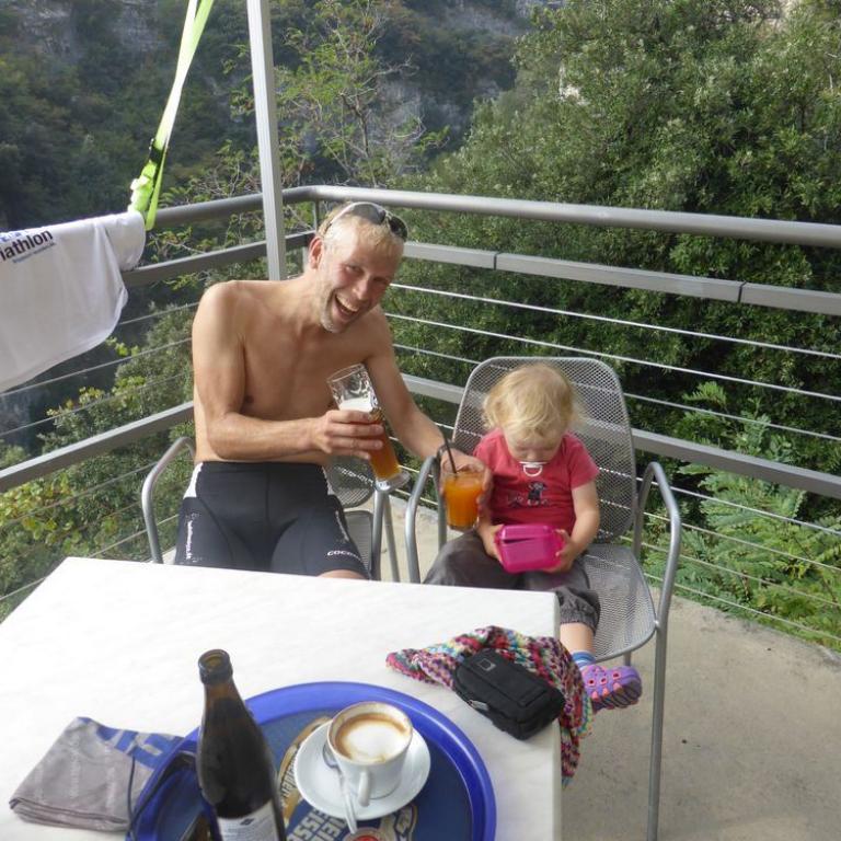 Später liefen wir dann mit Emma im Babyjogger los, bis nach Torbole zum 3S Bike Center, wo wir unser reserviertes Mouintainbike abholten. Brigitte fuhr dann weiter mit dem MTB und ich lief weiterhin mit dem Babyjogger. Zuerst noch flach an der Uferpromenade bis nach Riva del Garda. Dort wollte ich mal testen wie weit ich lauftechnisch auf der Ponale mit dem Babyjogger kam. Es ging super und ich konnte mehrere Mountainbiker überholen. Ich lief und Brigitte fuhr bis zur Bar Ponale Alto Belvedere, wo wir uns dann Nudeln und eine alkoholfreies Weißbier genehmigten. Emma war begeistert von der holprigen Strecke rauf wie auch dann wieder runter. In Riva kauften wir uns dann ein Eis, fanden natürlich noch einen Spielplatz und liefen dann wieder nach Torbole und von dort auf dem Radweg zurück in Richtung Arco und zu unserer Unterkunft. Die letzten Kilometer ging mir dann der Saft etwas aus, da der Lauf mit Babyjogger ganz schön anstrengend auf Dauer war. Insgesamt kam ich dann auf 27 Laufkilometer :-)