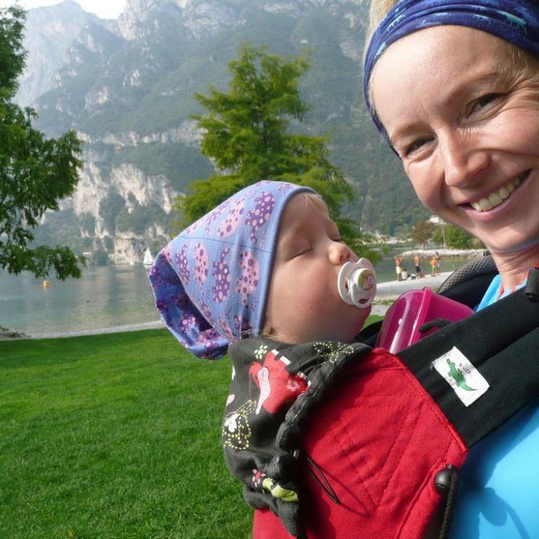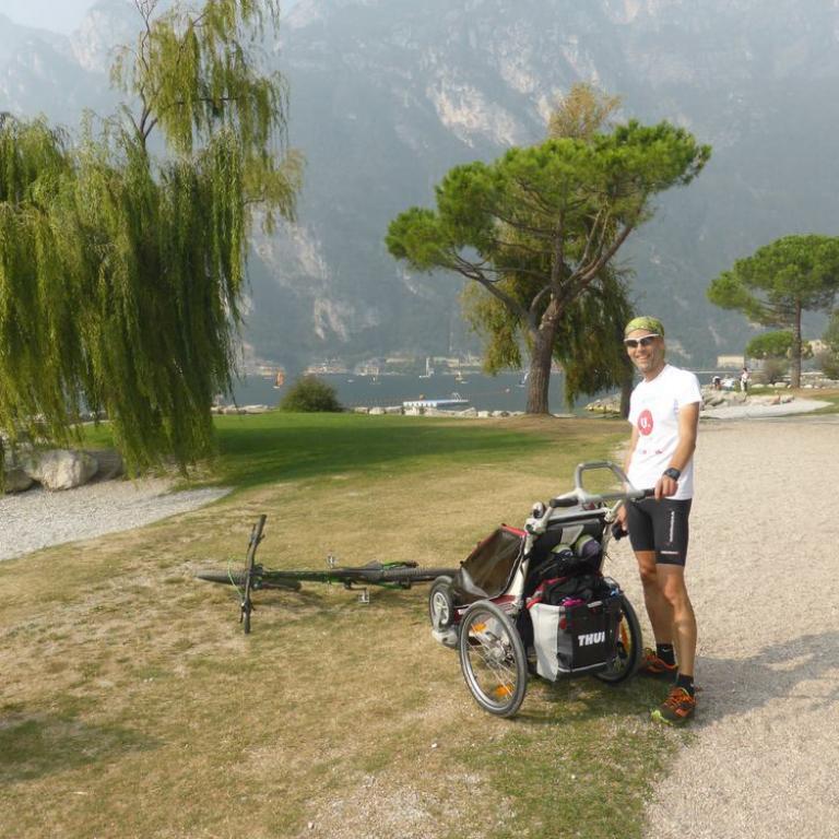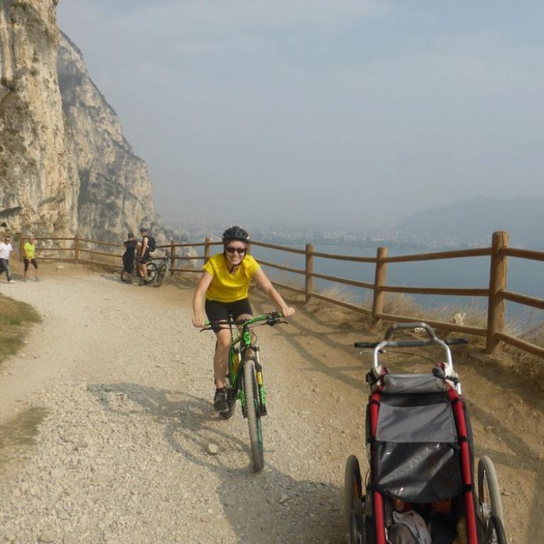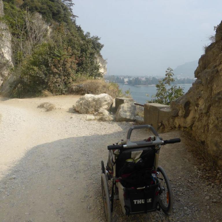 Später liefen wir dann mit Emma im Babyjogger los, bis nach Torbole zum 3S Bike Center, wo wir unser reserviertes Mouintainbike abholten. Brigitte fuhr dann weiter mit dem MTB und ich lief weiterhin mit dem Babyjogger. Zuerst noch flach an der Uferpromenade bis nach Riva del Garda. Dort wollte ich mal testen wie weit ich lauftechnisch auf der Ponale mit dem Babyjogger kam. Es ging super und ich konnte mehrere Mountainbiker überholen. Ich lief und Brigitte fuhr bis zur Bar Ponale Alto Belvedere, wo wir uns dann Nudeln und eine alkoholfreies Weißbier genehmigten. Emma war begeistert von der holprigen Strecke rauf wie auch dann wieder runter. In Riva kauften wir uns dann ein Eis, fanden natürlich noch einen Spielplatz und liefen dann wieder nach Torbole und von dort auf dem Radweg zurück in Richtung Arco und zu unserer Unterkunft. Die letzten Kilometer ging mir dann der Saft etwas aus, da der Lauf mit Babyjogger ganz schön anstrengend auf Dauer war. Insgesamt kam ich dann auf 27 Laufkilometer :-)