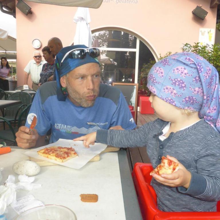 Da sich Brigitte auch noch sportlich betätigen wollte, stellte ich mich natürlich auch gleich wieder als Trainingspartner zur Verfügung :-) Mit dem Babyjogger und einer gut aufgelegten Emma lief ich und Brigitte fuhr mit dem MTB in Richtung Padaro. Wir kämpften uns die steile Straße 330 Hm auf 2,5 Kilometer nach oben. Dort trafen wir dann bei der Anna-Maria alle anderen Alpenvereinsmitglieder. Wir tranken eine Radler und liefen bzw. fuhren dann wieder nach unten. Später gingen wir zusammen mit den DAV lern zum Pizzaessen :-)