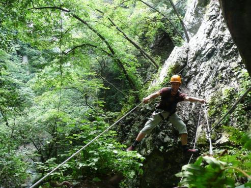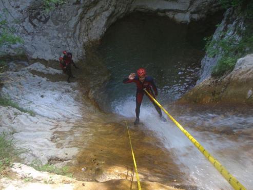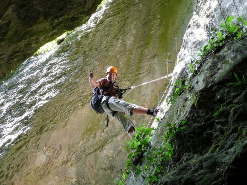Nach der Entspannung am Pool fuhren wir zum Startpunkt der Tour: Nachmittag 15 Uhr die Ortschaft Aer und gehört zu Tignale. Wir wurden von unserem Guide abgeholt und zuerst eingekleidet. Bei herrlich warmen Temperaturen gingen wir zuerst ein paar Meter zum Einstieg. Dort bekamen wir eine Sicherheitseinweisung, bevor es los ging mit der Tour "Gumpenfieber 1". Über Rutschen, Sprünge bis zu 6 Meter, einige Abseiler ging es durch den Canyon. Insgesamt 14 Gumpen mussten wir überwinden. Es war für uns natürlich ein riesen Spaß. Zum Schluß wurden wir noch einen über 10 Meter hohen Wasserfall abgeseilt und die letzten Meter springend überwunden. Nach ca. 2 Stunden stiegen wir aus der Schlucht über einen Trampelpfad hinaus.