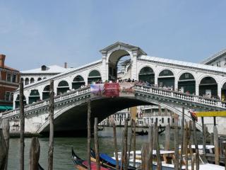 Von Westen kommend erreichten wir dann den Markusplatz mit dem Markusdom im Hintergrund. Mit dem Vaporetto fuhren wir auf dem Canal Grande Richtung Rialto Brücke. Dort gingen wir wieder an Land und schlenderten über die berühmte Brücke. Die Brücke überspannt den Canal Grande und hat eine Spannweite von 48 m, eine Breite von 22 m und eine Durchfahrtshöhe von 7,50 m.