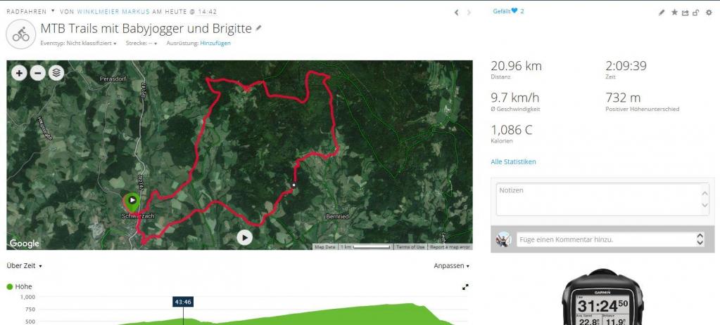 Von Schwarzach fuhren wir bei leichtem Nieselregen in Richtung Wimpasing, von dort über Höhenberg bis nach Böbrach. Hier führte uns ein steiler Weg nach oben bis zur Dampfsäge. Ein steiler Trail, wo wir schieben mussten und mit Babyjogger nicht so einfach war, schlängelte sich bis zur Diensthütte Grandsberg. Beim Menauer kehrten wir ein, wo Emma das Wirtshaus auf den Kopf stellte und Papa und Mama eine Radlermaß und etwas leckeres zum Essen bekamen. Gestärkt sausten wir zurück nach Hause.