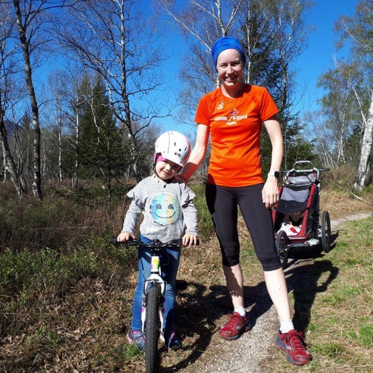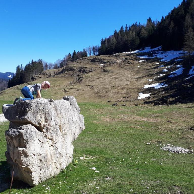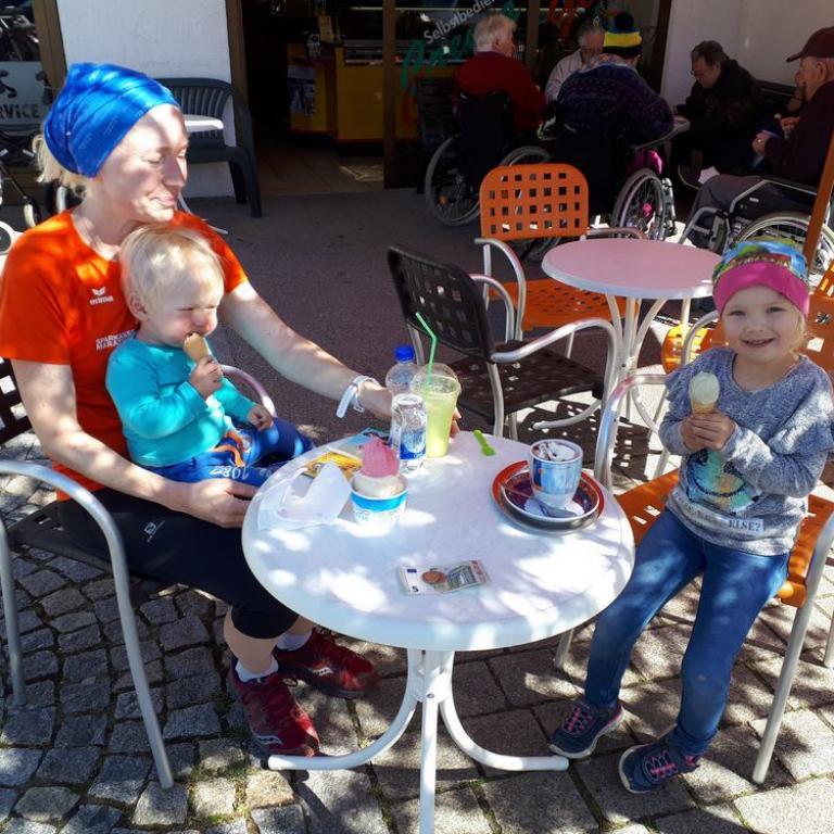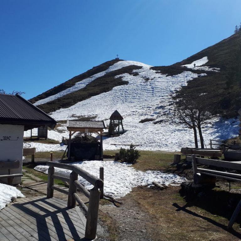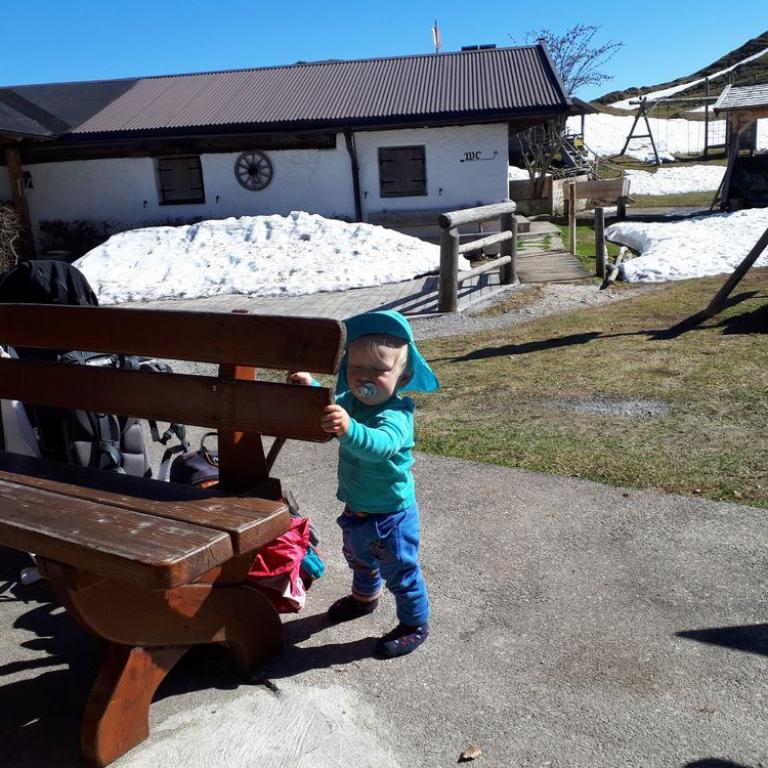 Das Traumwetter zog uns früh aus der gemütlichen Wohnung. Emma fuhr mit dem Mountainbike, ich lief mit Timi im Babyjogger und Brigitte lief ohne Ballast :-) Es war herrlich über den Grassauer Golfplatz zu laufen. Von dort joggten wir ins Moor. Emma fuhr fleißig mit dem MTB mit und hielt sich auch in den Wurzeltrails ganz wacker. Natürlich durfte ein Spielplatzbesuch nicht fehlen. Zurück in der Wohnung packten wir unsere Wandersachen zusammen und fuhren über die Autobahn in Richtung Kufstein. Auf der Inntalautobahn bis zur Ausfahrt Nußdorf und anschließend in den Ort hinein. Bei der Verzweigung rechts nach Erl. In Erl biegt man nach der Kirche links ab Richtung Erlerberg / Spitzstein / Kranzhorn. Man fährt die Bergstraße hinauf bis in einer Linkskurve (Hinweisschild: Kranzhornhütte) eine ziemlich kleine Straße links abzweigt. Bei einer Straßenkehre im Wald folgt man nicht der Rechtskehre über die Brücke, sondern fährt ca. 200 Meter weiter gerade bergan zum ausgeschilderten Parkplatz Kranzhornalm. Unsere Zwerge schliefen den Schlaf der Gerechten im Auto und wir mussten beide aufwecken. Timi durfte in die Kraxe und Emma ging selbst. Über herrliche Almwiesen, wo die Frühjahrsblumen blühten, stiegen wir in Richtung Kranzhornhütte auf. Weiter oben trafen wir auf einige Schneefelder, die sich noch hartnäckig hielten. Nach ca. 1 Stunden erreichten wir die Alm auf 1222 m. Die Kranzhornalm lag noch im Schnee, aber hatte schon offen. Wir genossen Kuchen und dazu ein leckeres Weißbier in der Sonne. Langsam machten wir uns wieder auf den Rückweg zum Parkplatz. Am Abend fielen unsere Zwerge ins Bett, denn die frische Luft machte müde :-)