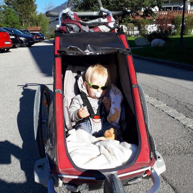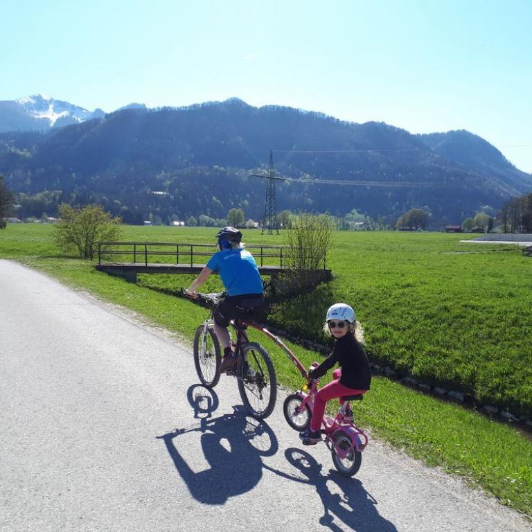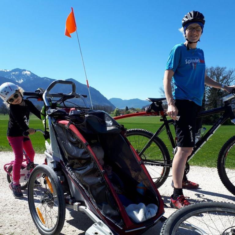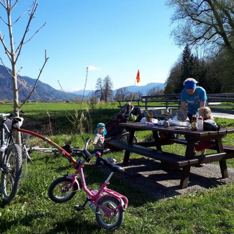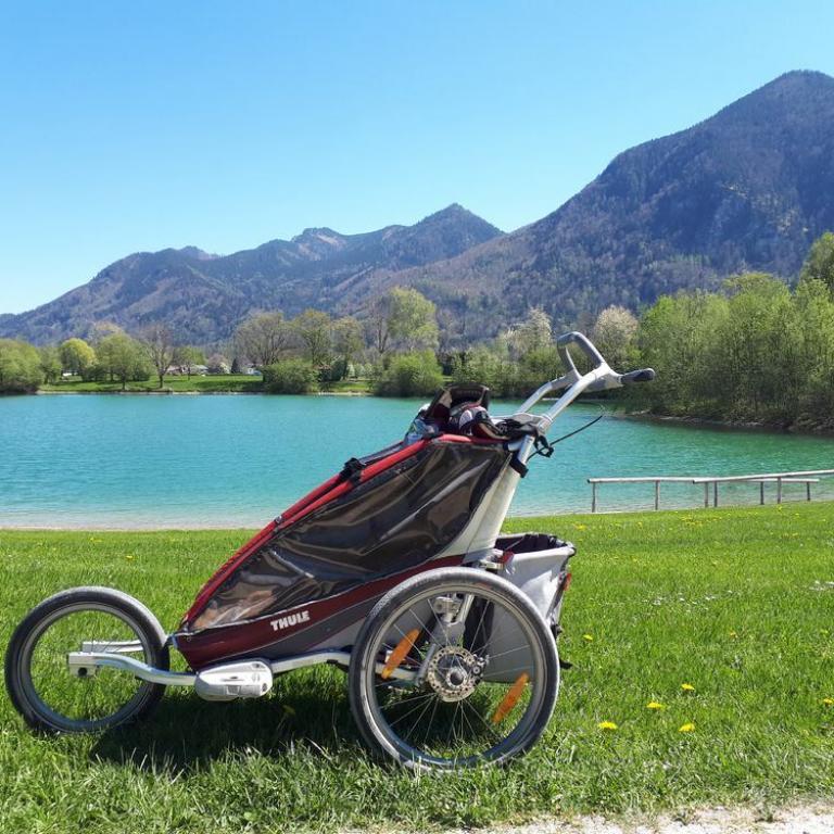 Nach einem kleinen Frühstück radelten wir mit den Mountainbikes los. Emma hing mit ihrem Puky an Brigittes MTB und ich zog Timi im Babyjogger. Über Panoramawege mit Blick auf schneebedeckte Berge fuhren wir bis zum Chiemsee. Ganz klar war unser Ziel ein kleiner Spielplatz für die Zwerge. Nach einer kleinen Stärkung radelten wir am Chiemseeufer entlang bis Bernau, wo wir den nächsten Spielplatz unsicher machten :-) Auf Radwegen fuhren wir über den Grassauer Golfplatz zurück in Richtung Wohnung. An einer sonnigen Bank machten wir Halt und kochten mit unserem Gaskocher Kartoffelbrei und dazu gab es Tomatenfisch :-) Nach der Brotzeit ging es zurück in die Wohnung wo alle in die Badewanne durften