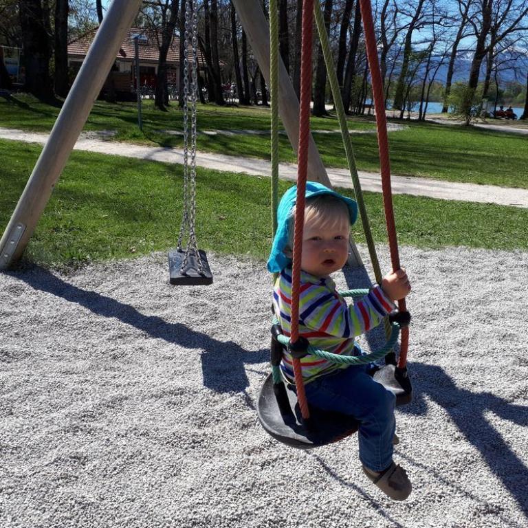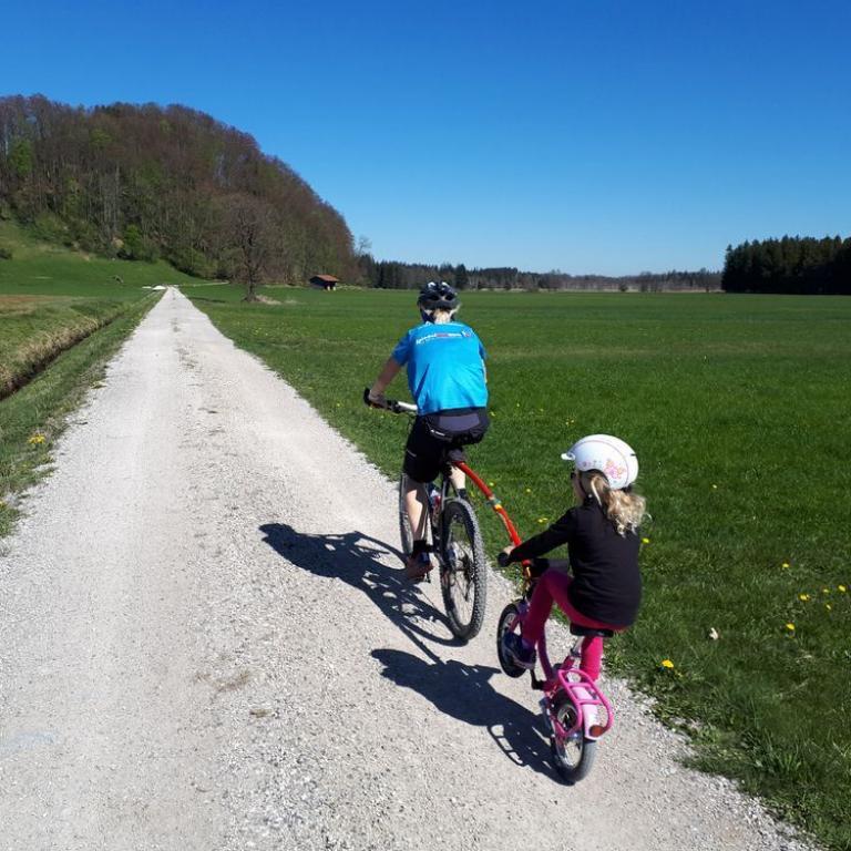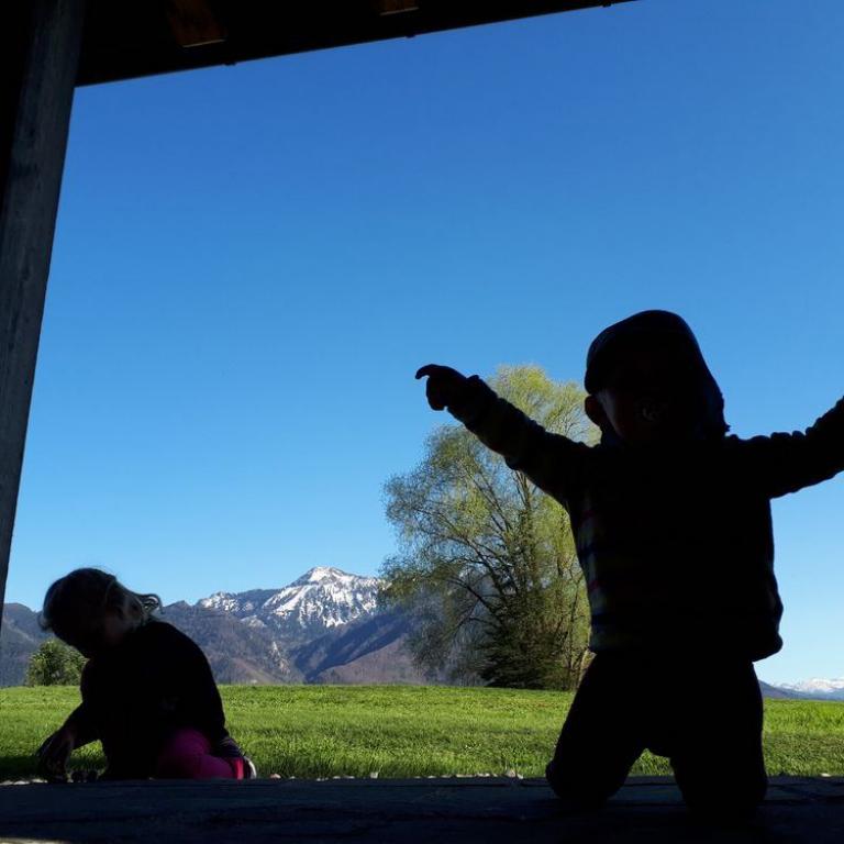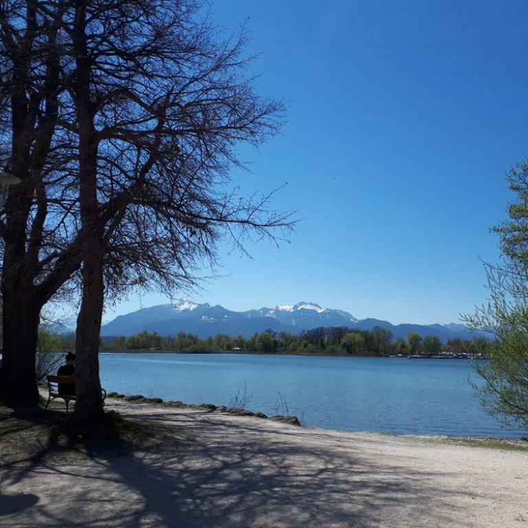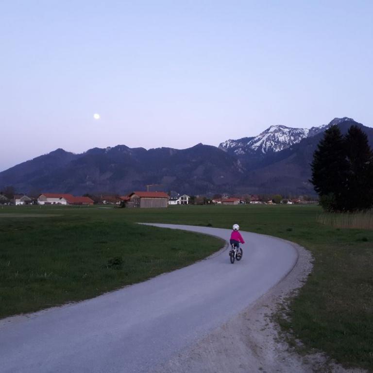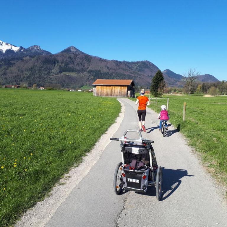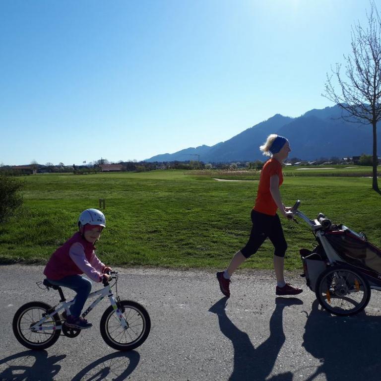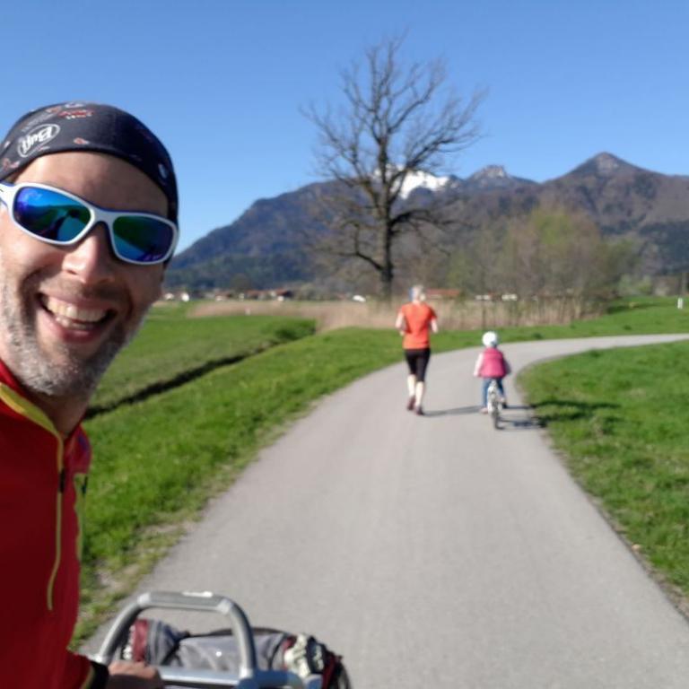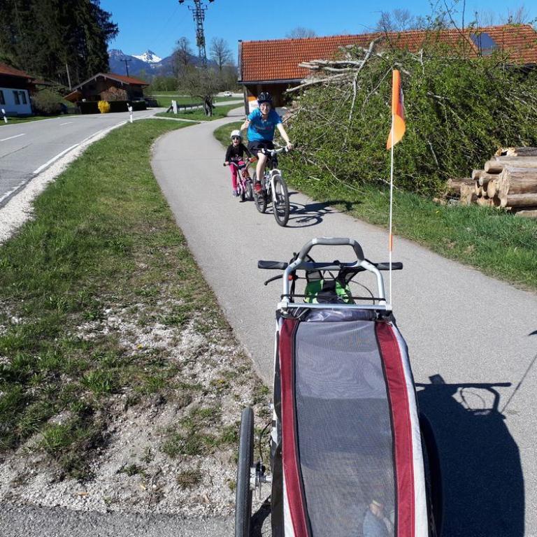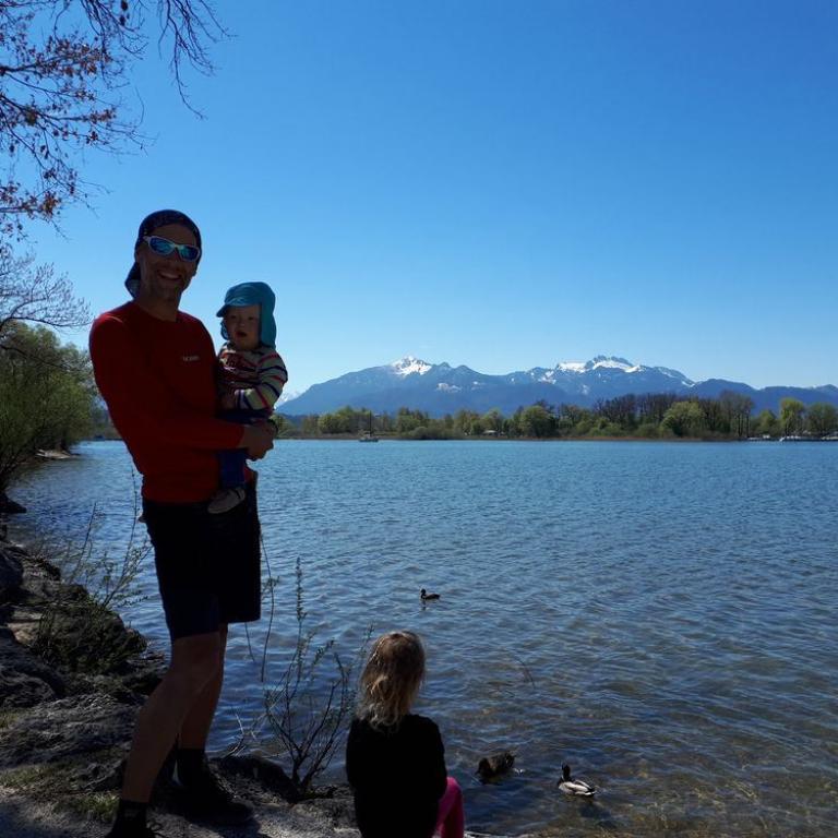 Nach einem kleinen Frühstück radelten wir mit den Mountainbikes los. Emma hing mit ihrem Puky an Brigittes MTB und ich zog Timi im Babyjogger. Über Panoramawege mit Blick auf schneebedeckte Berge fuhren wir bis zum Chiemsee. Ganz klar war unser Ziel ein kleiner Spielplatz für die Zwerge. Nach einer kleinen Stärkung radelten wir am Chiemseeufer entlang bis Bernau, wo wir den nächsten Spielplatz unsicher machten :-) Auf Radwegen fuhren wir über den Grassauer Golfplatz zurück in Richtung Wohnung. An einer sonnigen Bank machten wir Halt und kochten mit unserem Gaskocher Kartoffelbrei und dazu gab es Tomatenfisch :-) Nach der Brotzeit ging es zurück in die Wohnung wo alle in die Badewanne durften