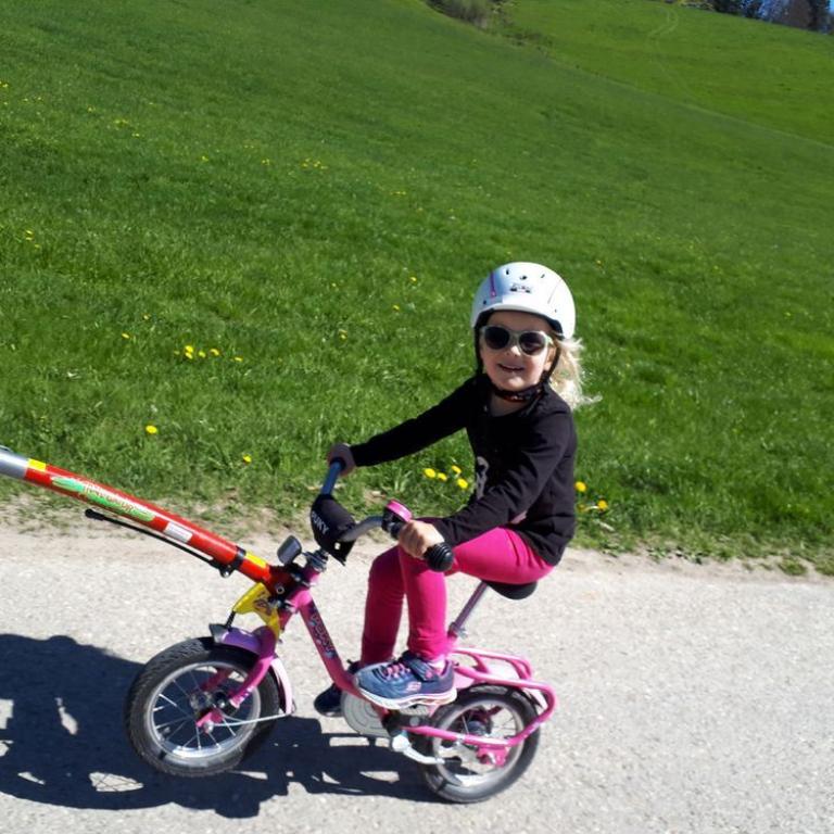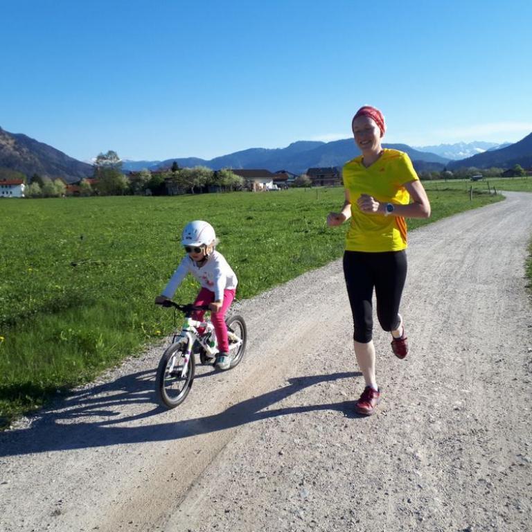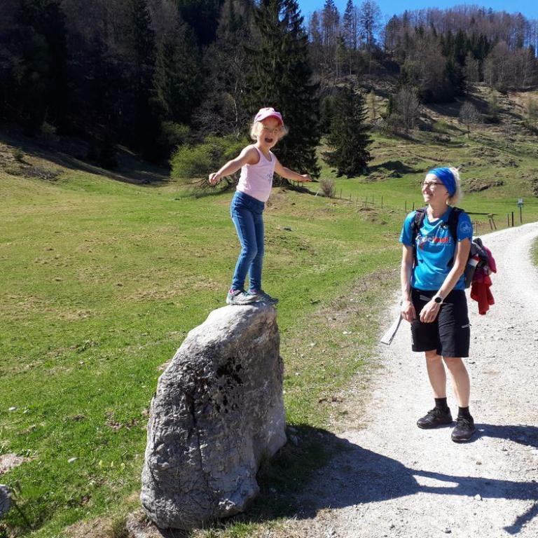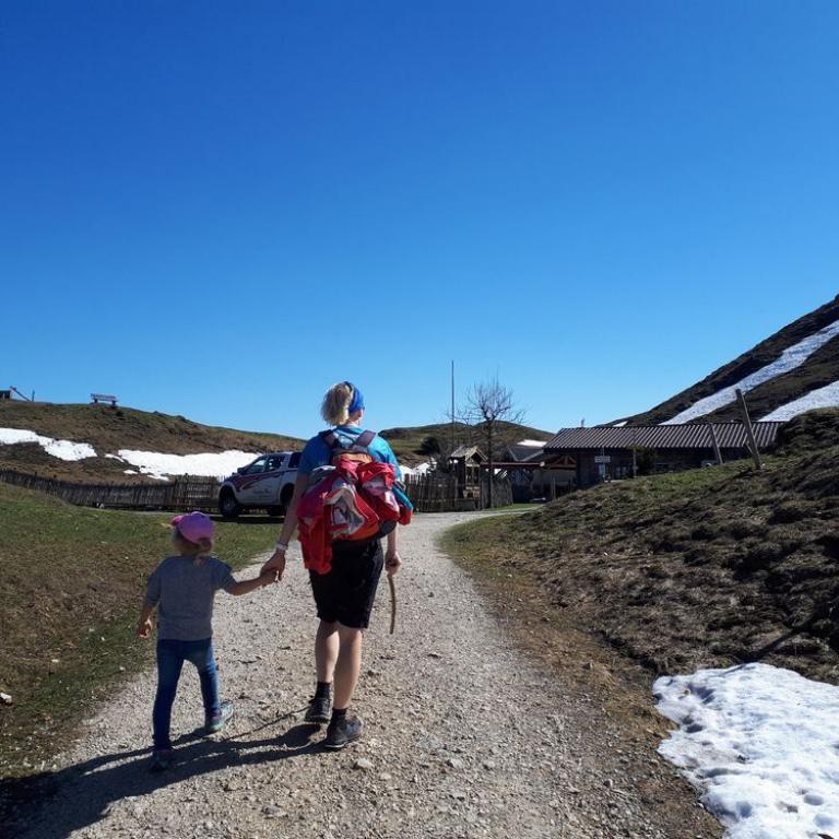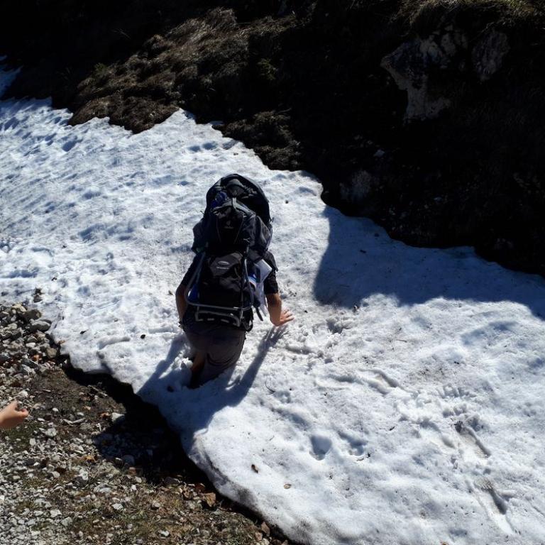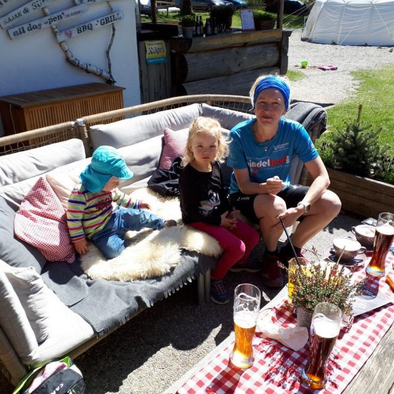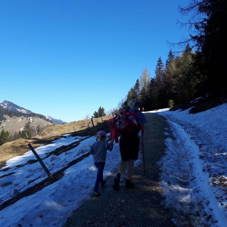 Das Traumwetter zog uns früh aus der gemütlichen Wohnung. Emma fuhr mit dem Mountainbike, ich lief mit Timi im Babyjogger und Brigitte lief ohne Ballast :-) Es war herrlich über den Grassauer Golfplatz zu laufen. Von dort joggten wir ins Moor. Emma fuhr fleißig mit dem MTB mit und hielt sich auch in den Wurzeltrails ganz wacker. Natürlich durfte ein Spielplatzbesuch nicht fehlen. Zurück in der Wohnung packten wir unsere Wandersachen zusammen und fuhren über die Autobahn in Richtung Kufstein. Auf der Inntalautobahn bis zur Ausfahrt Nußdorf und anschließend in den Ort hinein. Bei der Verzweigung rechts nach Erl. In Erl biegt man nach der Kirche links ab Richtung Erlerberg / Spitzstein / Kranzhorn. Man fährt die Bergstraße hinauf bis in einer Linkskurve (Hinweisschild: Kranzhornhütte) eine ziemlich kleine Straße links abzweigt. Bei einer Straßenkehre im Wald folgt man nicht der Rechtskehre über die Brücke, sondern fährt ca. 200 Meter weiter gerade bergan zum ausgeschilderten Parkplatz Kranzhornalm. Unsere Zwerge schliefen den Schlaf der Gerechten im Auto und wir mussten beide aufwecken. Timi durfte in die Kraxe und Emma ging selbst. Über herrliche Almwiesen, wo die Frühjahrsblumen blühten, stiegen wir in Richtung Kranzhornhütte auf. Weiter oben trafen wir auf einige Schneefelder, die sich noch hartnäckig hielten. Nach ca. 1 Stunden erreichten wir die Alm auf 1222 m. Die Kranzhornalm lag noch im Schnee, aber hatte schon offen. Wir genossen Kuchen und dazu ein leckeres Weißbier in der Sonne. Langsam machten wir uns wieder auf den Rückweg zum Parkplatz. Am Abend fielen unsere Zwerge ins Bett, denn die frische Luft machte müde :-)
