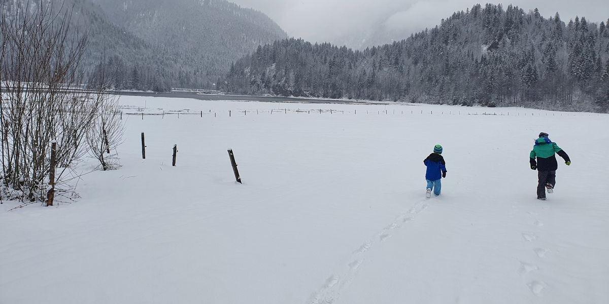 Mittag wollten wir aber dann raus und fuhren nach Reit im Winkl. Hier lag so richtig viel Neuschnee. Wir fuhren vorbei am Seegatterl, wo die Seilbahn zur Winklmoosalm nach oben führt. In Richtung Ruhpolding befinden sich die herrlichen Weitseen. Hier fanden wir direkt neben der urigen Sachenbacher Alm einen Parkplatz.