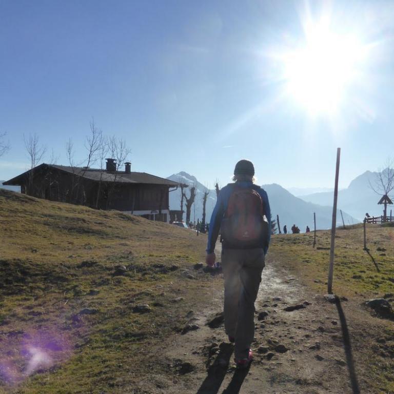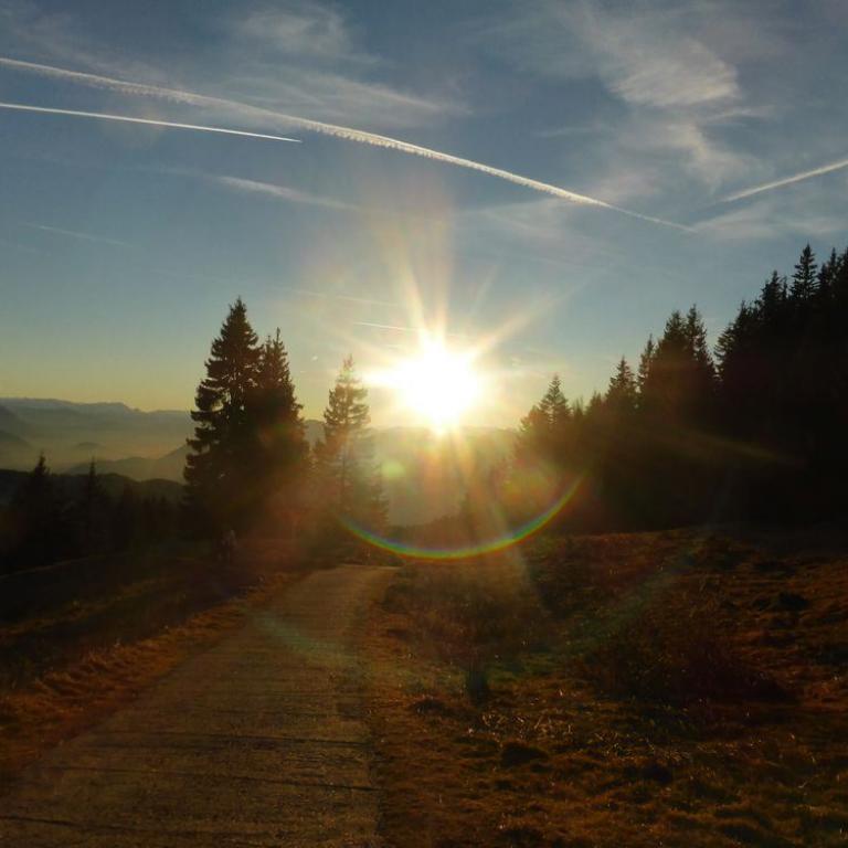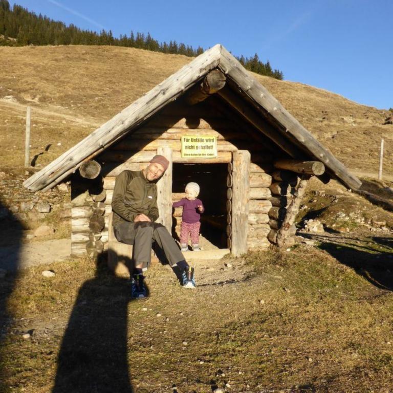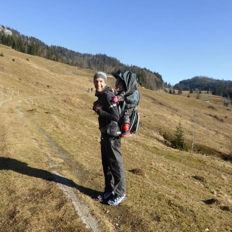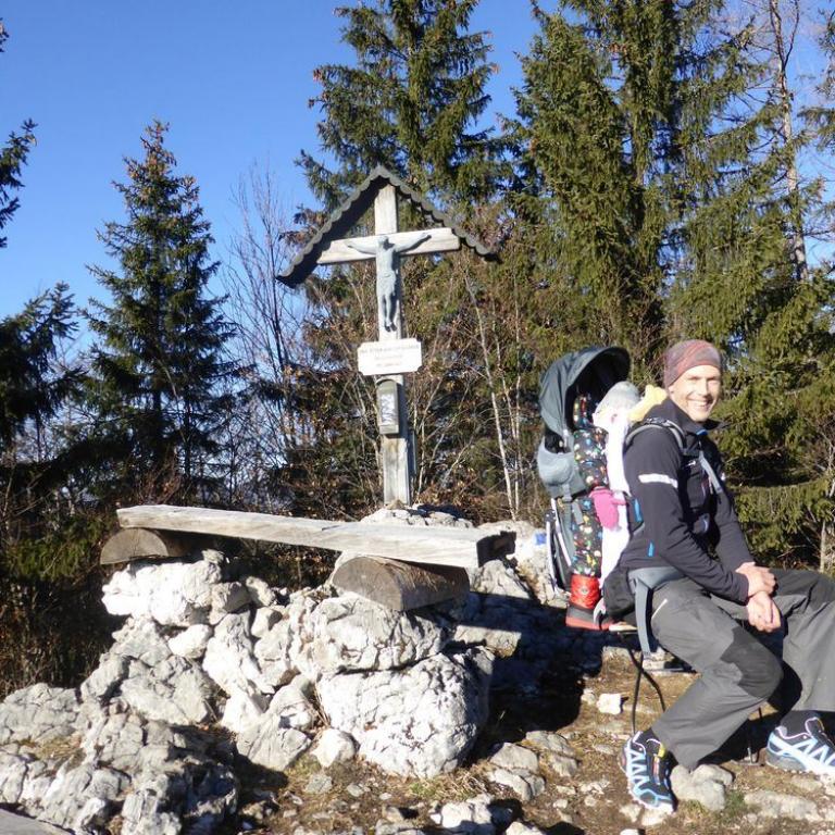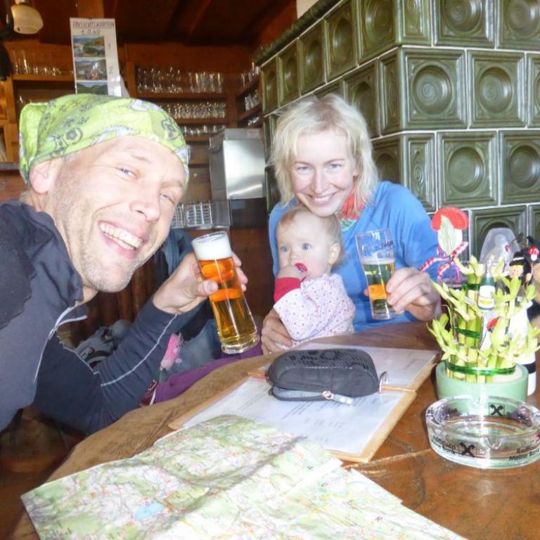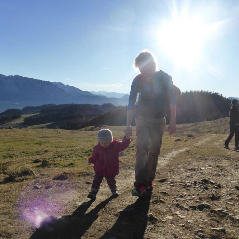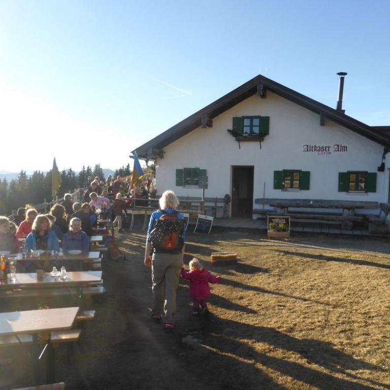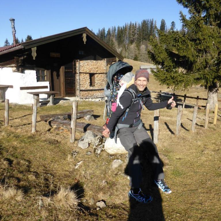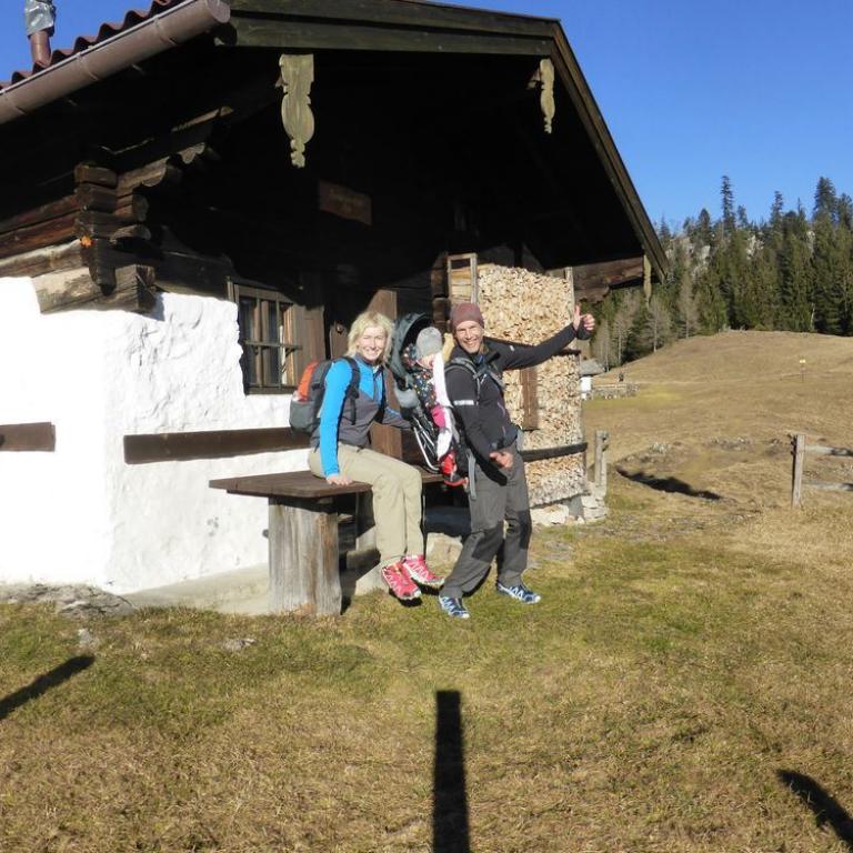 Heute stand zuerst Spielstunde mit Emma auf dem Plan, dann fuhren wir zum Einkaufen und Shoppen. Brigitte, Emma und ich bekamen neue Schuhe. Brigitte und ich natürlich Salomon Traillaufschuhe :-) Auch ein Besuch in einem Cafe durfte nicht fehlen, wo schon mal ein Zuckerglas zu Bruch ging. Aber Scherben bringen Glück. Im Anschluss trafen wir uns noch mit Brigittes Eltern, die zum Einkaufen im Outlet hier waren. Um das traumhafte Bergwetter noch genießen zu können fuhren wir drei nach Erl bei Kiefersfelden und von dort eine Panoramastraße zum Erlerbergparkplatz auf 935 m. Hier starteten wir bei Sonne und angenehmen Temperaturen unsere Tour am Spitzstein. Zuerst wanderten wir einen Trail durch den Wald und dann weiter auf sonnigen Almenwegen. Emma kämpfte sich fleißig selbst nach oben. Unser Ziel war die Altkaseralm (1279 m), oberhalb des Spitzsteinhauses. Hier genossen wir eine Radler, wieder einen "Nussler", Suppe und Kuchen und natürlich die traumhafte Aussicht auf das Kaisergebirge. Erst kurz vor Sonnenuntergang stiegen wir wieder zum Parkplatz ab und fuhren nach Grassau zurück. Hier lief ich noch zum Radshop und holte ein MTB, damit wir morgen biken konnten.