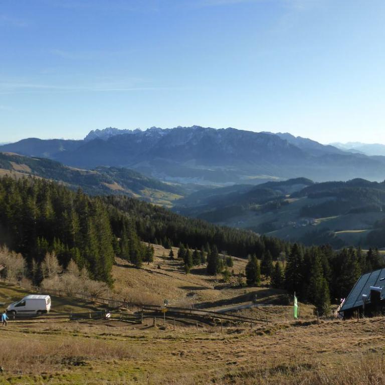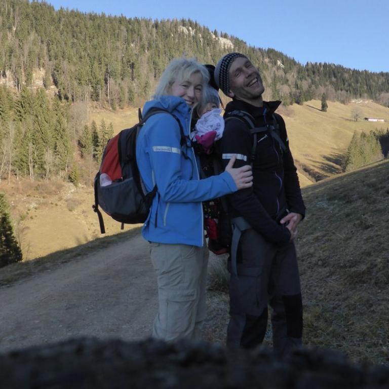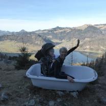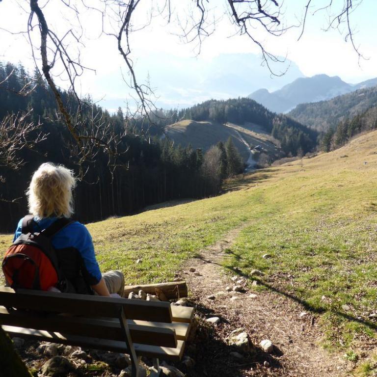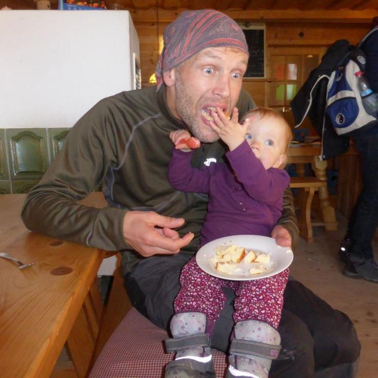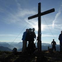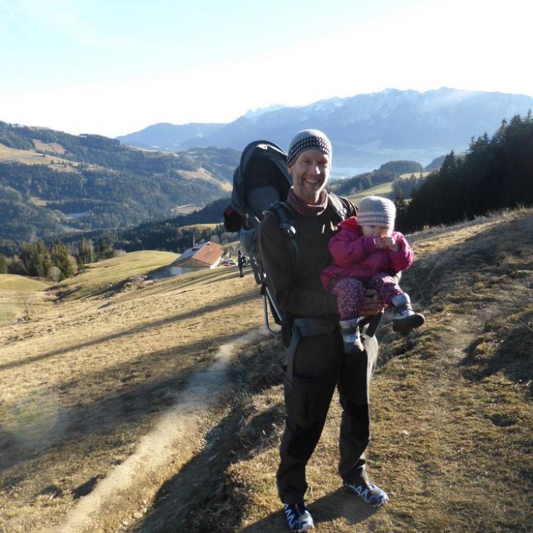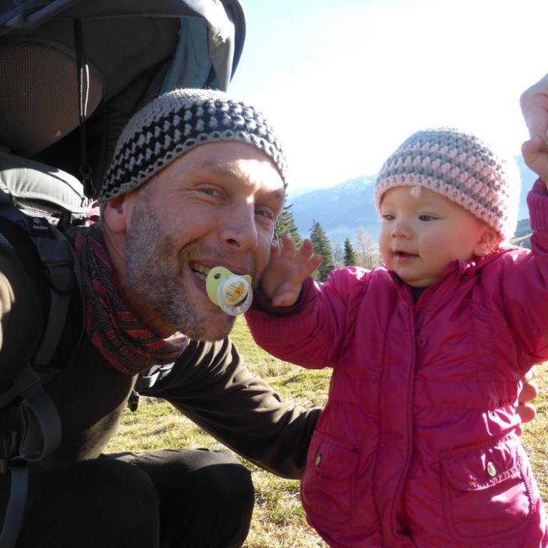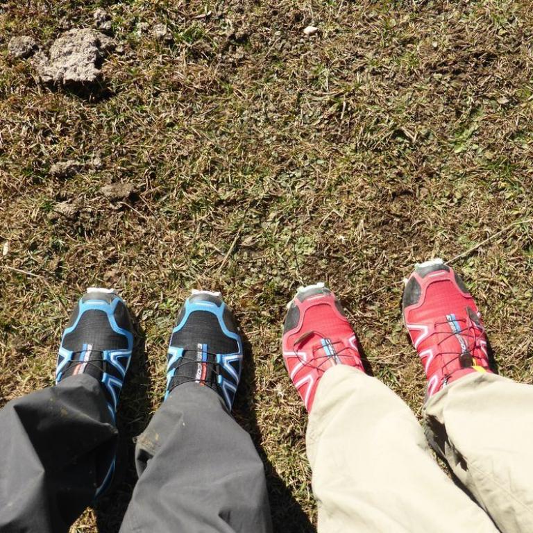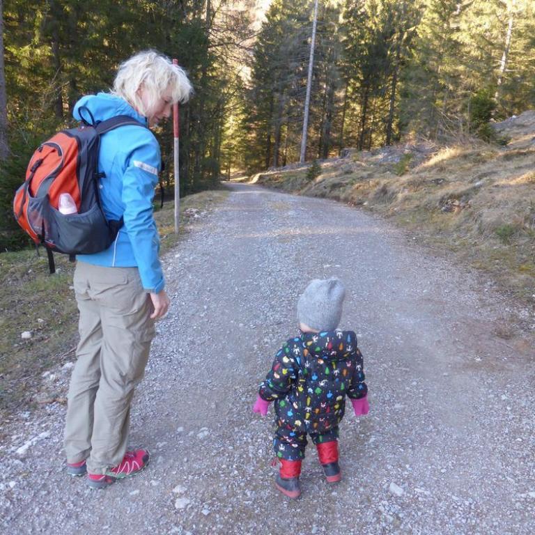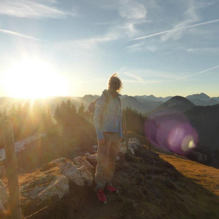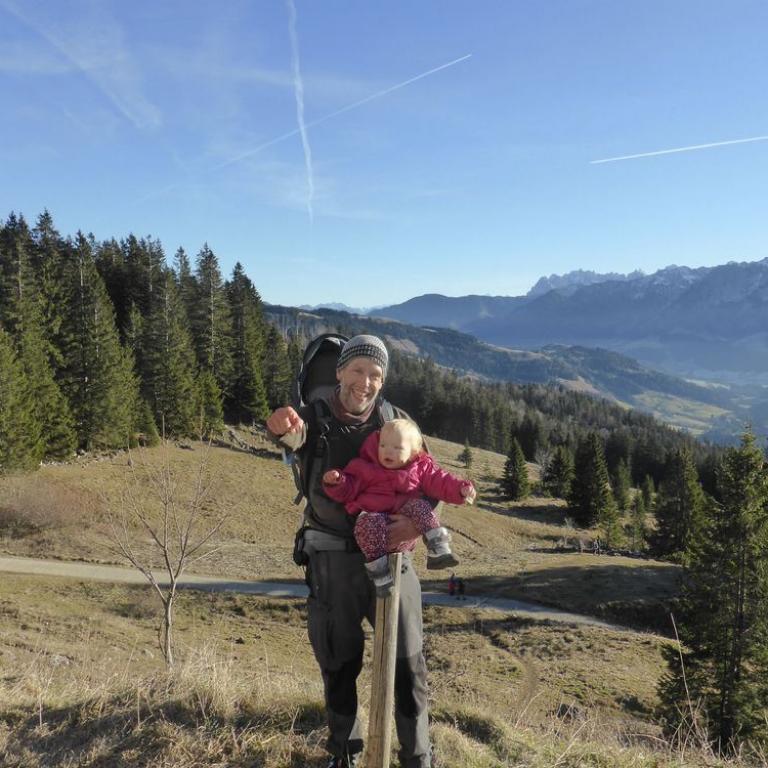 Heute stand zuerst Spielstunde mit Emma auf dem Plan, dann fuhren wir zum Einkaufen und Shoppen. Brigitte, Emma und ich bekamen neue Schuhe. Brigitte und ich natürlich Salomon Traillaufschuhe :-) Auch ein Besuch in einem Cafe durfte nicht fehlen, wo schon mal ein Zuckerglas zu Bruch ging. Aber Scherben bringen Glück. Im Anschluss trafen wir uns noch mit Brigittes Eltern, die zum Einkaufen im Outlet hier waren. Um das traumhafte Bergwetter noch genießen zu können fuhren wir drei nach Erl bei Kiefersfelden und von dort eine Panoramastraße zum Erlerbergparkplatz auf 935 m. Hier starteten wir bei Sonne und angenehmen Temperaturen unsere Tour am Spitzstein. Zuerst wanderten wir einen Trail durch den Wald und dann weiter auf sonnigen Almenwegen. Emma kämpfte sich fleißig selbst nach oben. Unser Ziel war die Altkaseralm (1279 m), oberhalb des Spitzsteinhauses. Hier genossen wir eine Radler, wieder einen "Nussler", Suppe und Kuchen und natürlich die traumhafte Aussicht auf das Kaisergebirge. Erst kurz vor Sonnenuntergang stiegen wir wieder zum Parkplatz ab und fuhren nach Grassau zurück. Hier lief ich noch zum Radshop und holte ein MTB, damit wir morgen biken konnten.