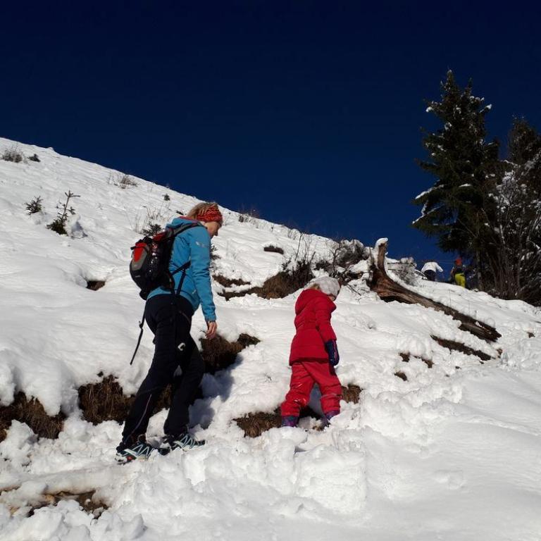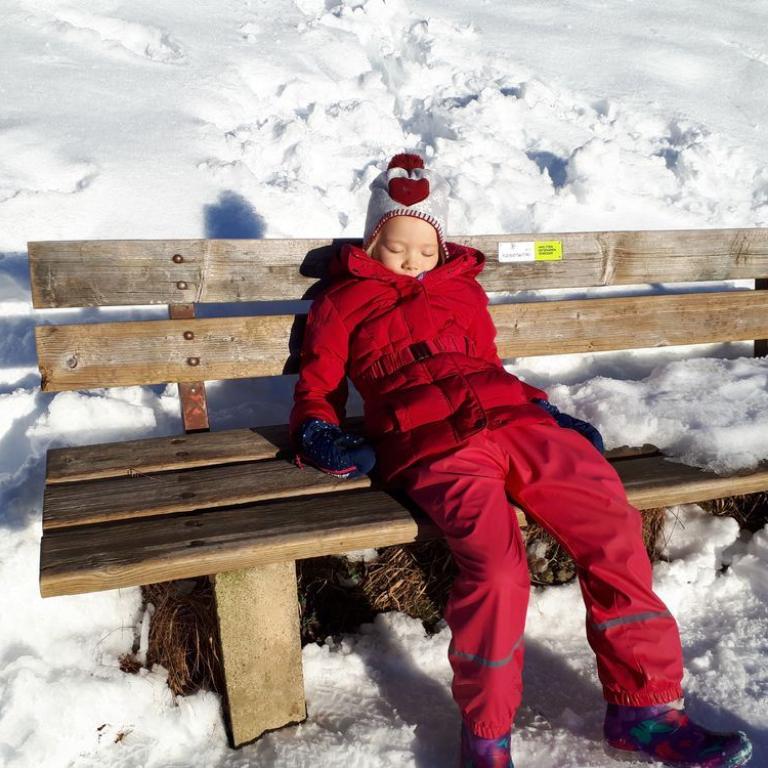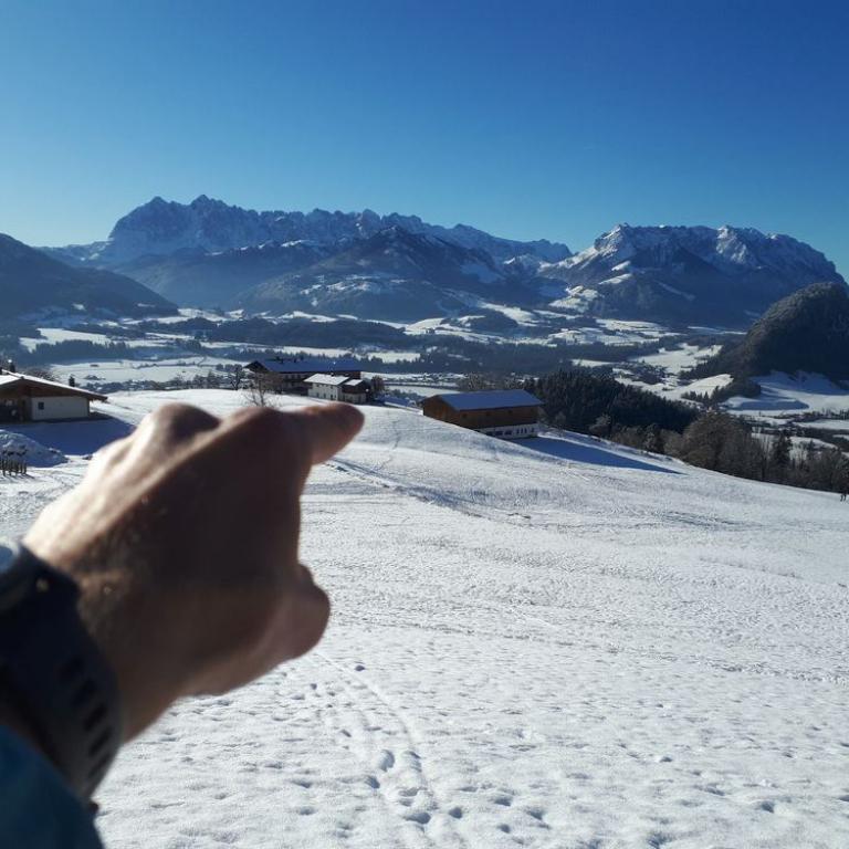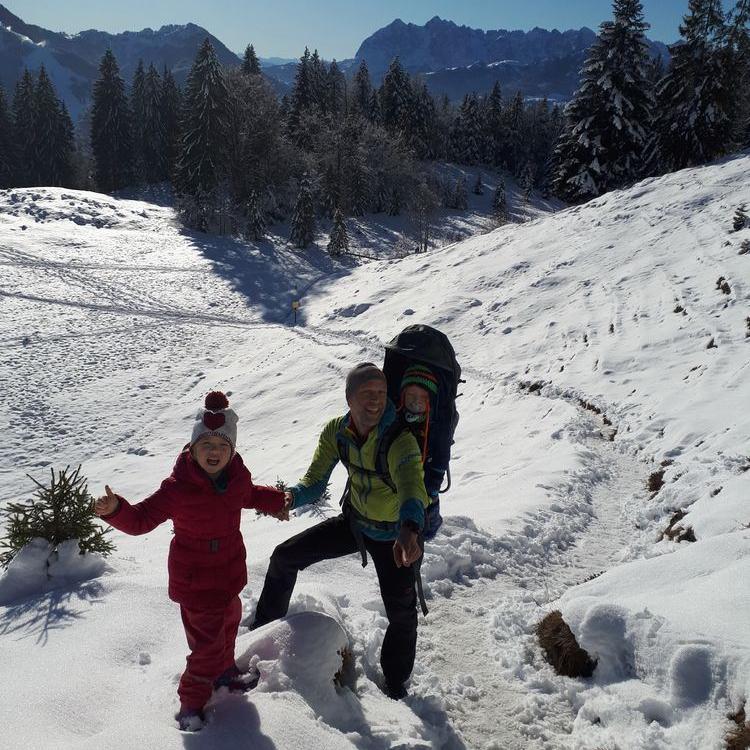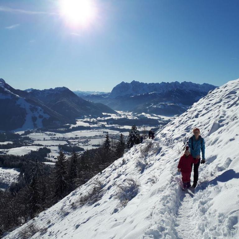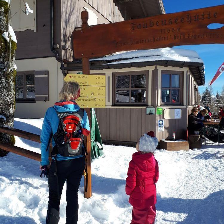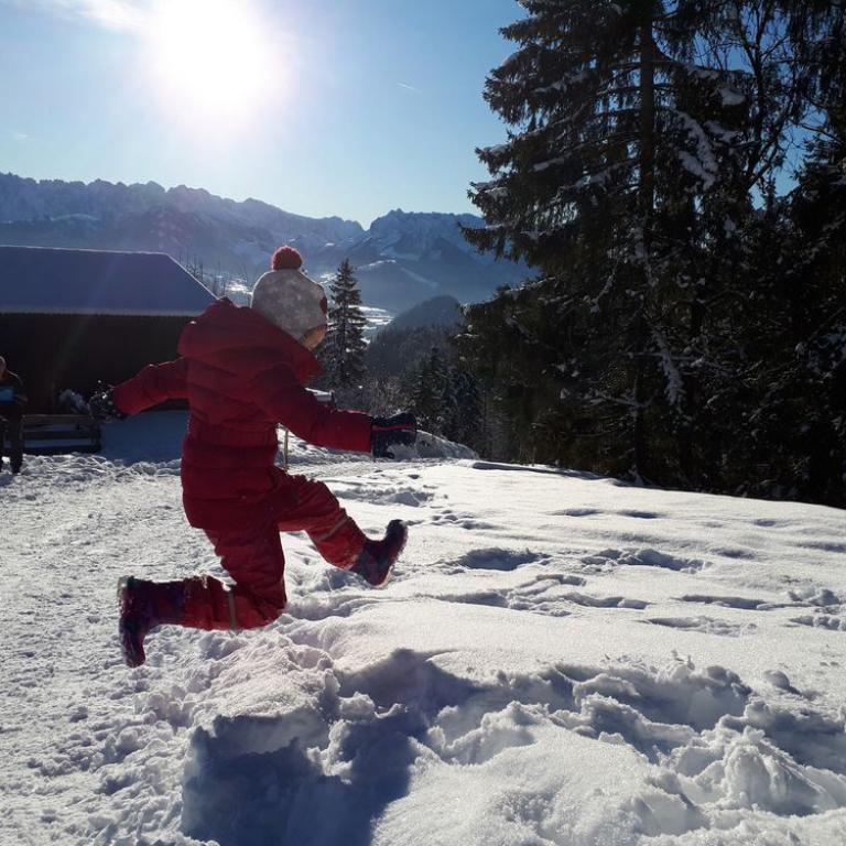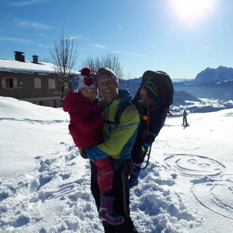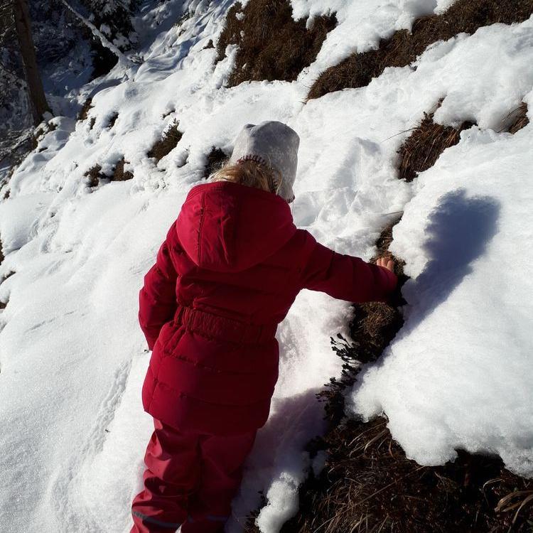 Eigentlich wollten wir schon früh nach Hause fahren, aber das schöne Bergwetter ließ uns nicht los. Nachdem wir unsere Siebensachen im Auto verstaut hatten fuhren wir nach Kössen, wo schon einiges an Schnee lag. Von hier fuhren wir zum gebührenpflichtigen Wanderparkplatz Mühlberg. Das Panorama war wie immer traumhaft. Vor uns der Wilde und Zahme Kaiser, die Loferer Steinberge und auch der Watzmann war zu sehen. Es lag Schnee und auch die Wege waren teilweise vereist, aber der Aufstieg machte trotzdem oder gerade deswegen Spaß. Unsere kleine Maus war zuerst nicht so begeistert, aber als wir uns dann ab der Moosenhütte auf einem Kraxelsteig nach oben kämpften, war Emma in ihrem Element :-) Nach ca. 1 Stunden erreichten wir die traumhaft gelegene Hütte bei Sonne und herrlicher Aussicht. Wir wanderten noch kurz zum Taubensee, der aber im Schatten lag und zugeschneit war. In der gefüllten Hütte kauften wir uns eine leckere Brotzeit, bevor wir auf dem Normalweg nach unten sausten. Emma und ich liefen und übten Sprünge in den Schnee und hatten dabei riesig Spaß, auch wenn wir ziemlich nass wurden. Nach der 3 Stunden Wanderung machten wir uns auf den Heimweg und konnten noch den Sonnenuntergang in den Bergen genießen