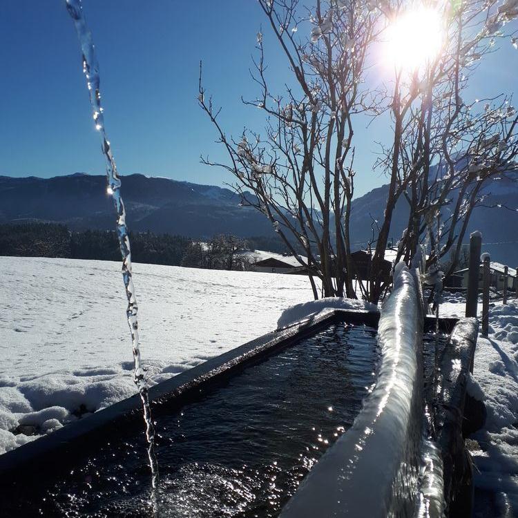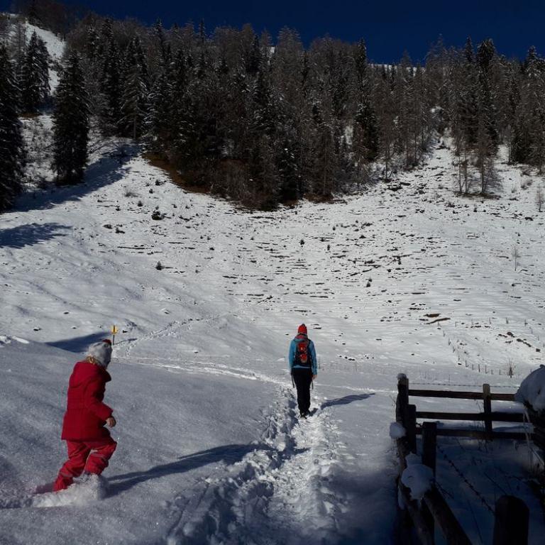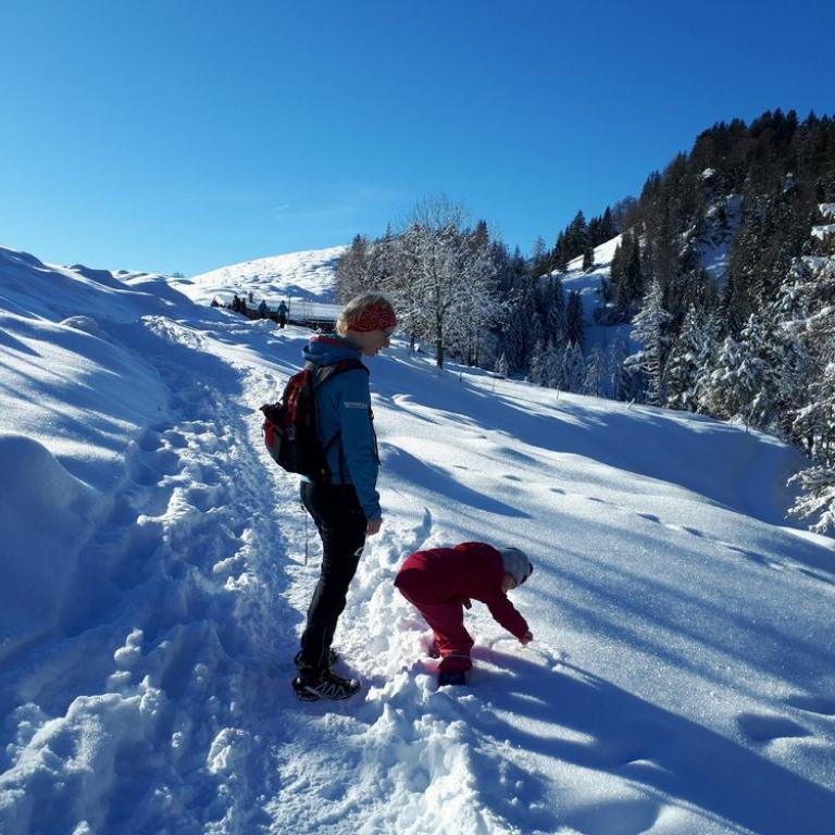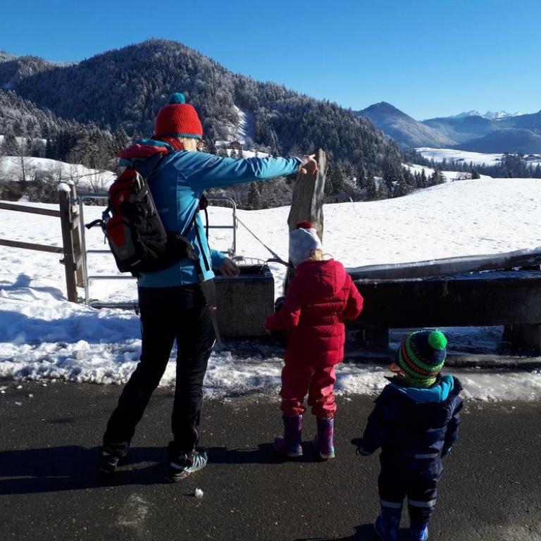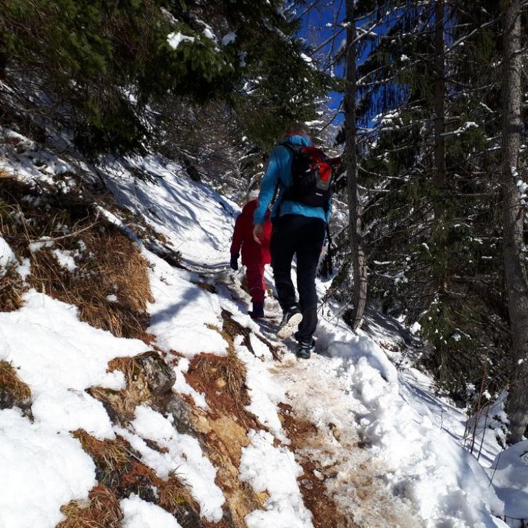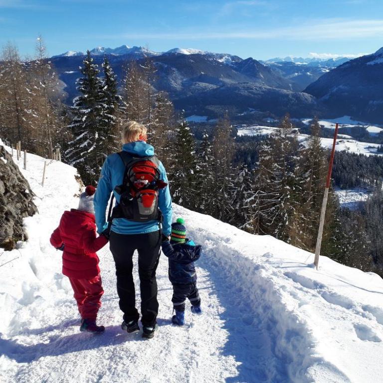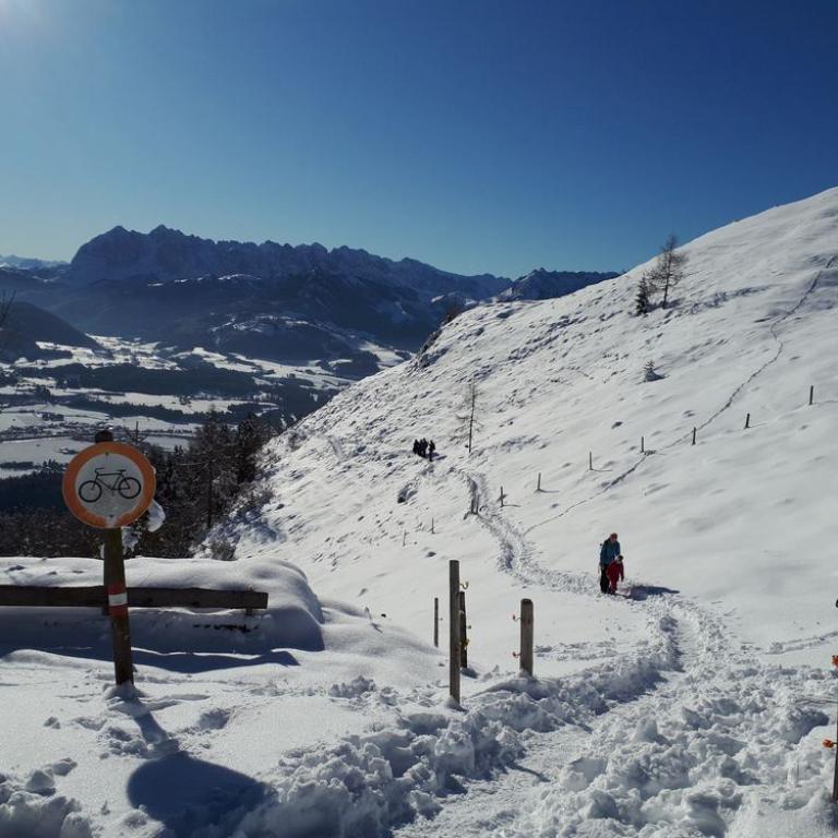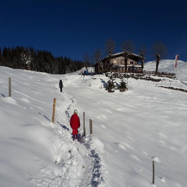 Eigentlich wollten wir schon früh nach Hause fahren, aber das schöne Bergwetter ließ uns nicht los. Nachdem wir unsere Siebensachen im Auto verstaut hatten fuhren wir nach Kössen, wo schon einiges an Schnee lag. Von hier fuhren wir zum gebührenpflichtigen Wanderparkplatz Mühlberg. Das Panorama war wie immer traumhaft. Vor uns der Wilde und Zahme Kaiser, die Loferer Steinberge und auch der Watzmann war zu sehen. Es lag Schnee und auch die Wege waren teilweise vereist, aber der Aufstieg machte trotzdem oder gerade deswegen Spaß. Unsere kleine Maus war zuerst nicht so begeistert, aber als wir uns dann ab der Moosenhütte auf einem Kraxelsteig nach oben kämpften, war Emma in ihrem Element :-) Nach ca. 1 Stunden erreichten wir die traumhaft gelegene Hütte bei Sonne und herrlicher Aussicht. Wir wanderten noch kurz zum Taubensee, der aber im Schatten lag und zugeschneit war. In der gefüllten Hütte kauften wir uns eine leckere Brotzeit, bevor wir auf dem Normalweg nach unten sausten. Emma und ich liefen und übten Sprünge in den Schnee und hatten dabei riesig Spaß, auch wenn wir ziemlich nass wurden. Nach der 3 Stunden Wanderung machten wir uns auf den Heimweg und konnten noch den Sonnenuntergang in den Bergen genießen