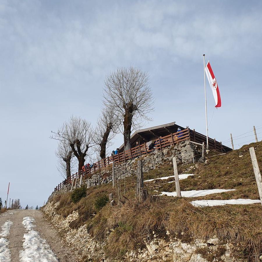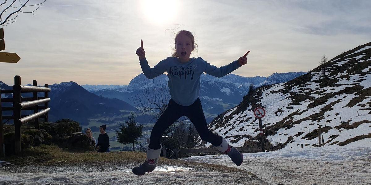 Am Wanderparkplatz Erlerberg lag einiges an Schnee, so dass wir uns entschieden, den Schlitten an den Rucksack zu packen. Wir wanderten vorbei an der Stoana Alm über verschneite Almwiesen bis zum Spitzsteinhaus. In der darüber liegenden Altkaser Alm machten wir Rast und stärkten uns mit Suppe und Schorle. Von hier ist es noch ca. 1 Stunde bis zum Spitzsteingipfel. Timi und Emma waren motiviert, somit entschieden wir uns, den Aufstieg zu versuchen. Durch den rutschigen Schnee kämpften wir uns den steilen Hang immer weiter nach oben. Teilweise krabbelten wir auf allen Vieren, um nicht abzurutschen. Das Abenteuer machte allen riesigen Spaß. Der Gipfel war in erreichbarer Nähe und die Mäuse ließen sich den Sieg nicht mehr nehmen. Stolz standen wir nach knapp 700 Höhenmetern und 2 1/2 Stunden Anstieg auf dem 1596 m hohen Spitzstein mit einer traumhaften Aussicht auf das Kaisergebirge.