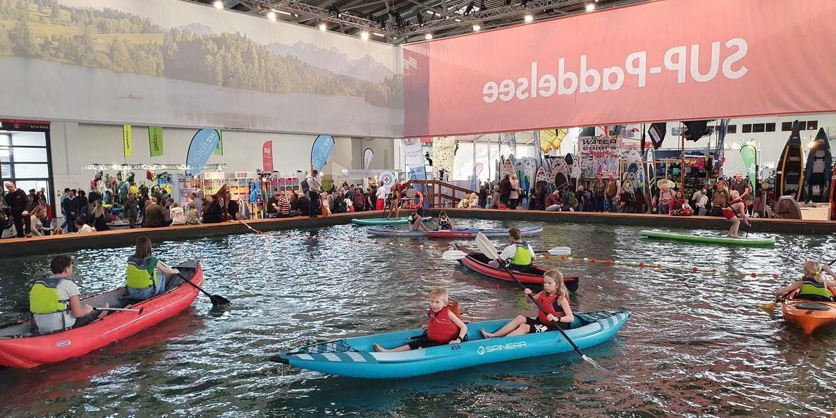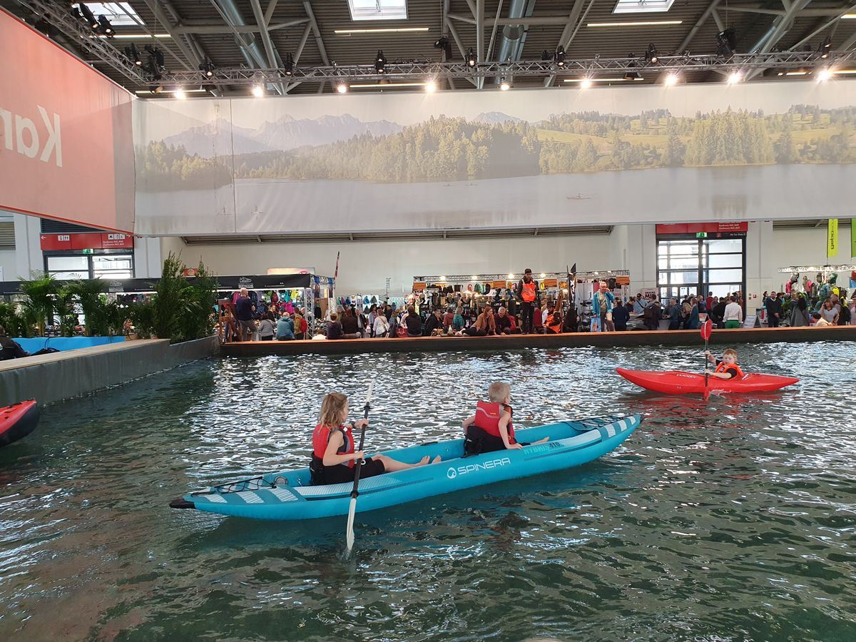 Unsere Kinder testen aufblasbare Kajaks in einem riesigen Becken. Eine Woche später kauften wir ein ITIWIT 2 Sitzer bei Decathlon um die Gewässer unseres Planeten unsicher zu machen. Wir besuchten den Ausstellungsstand des Deutschen Alpenvereins, wo die Kletterwand für Kinder sehr gefragt war.