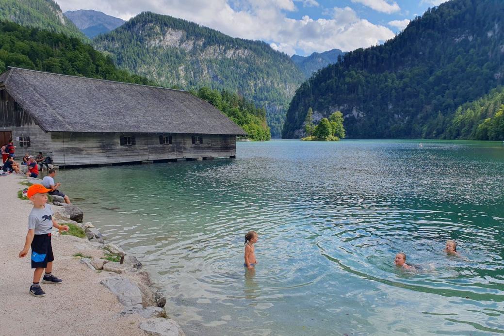 Zurück am Königssee gingen wir gemeinsam an eine kleine Badestelle und die Kinder und ich sprangen in den eisigen See, der mit dem Schmelzwasser der letzten Schneereste des Watzmanns gespeist wird.