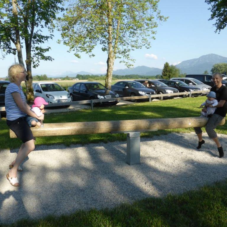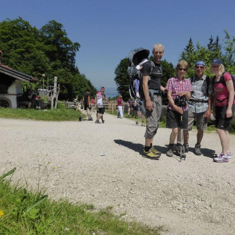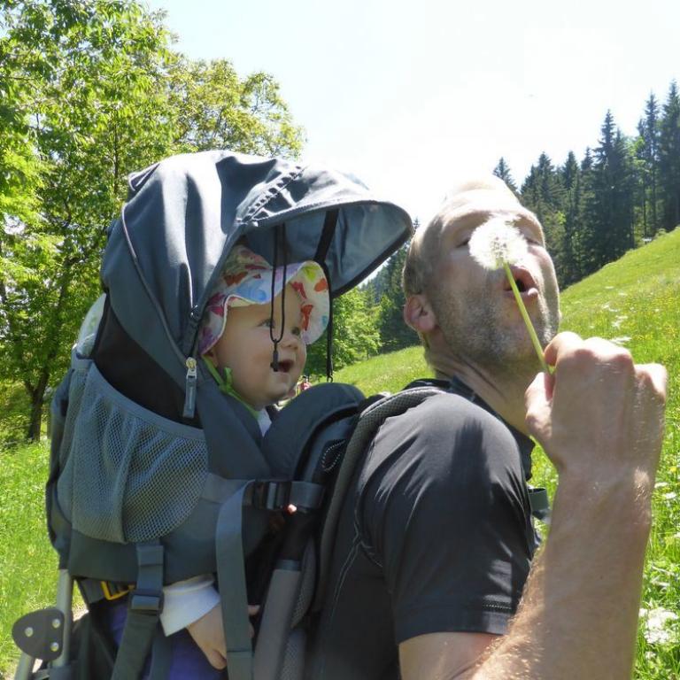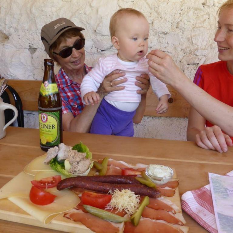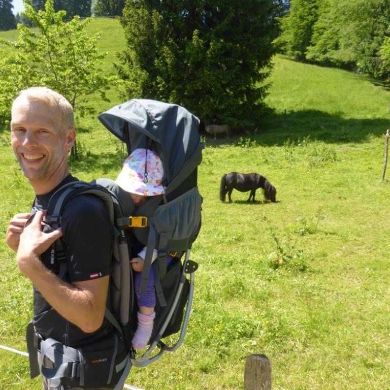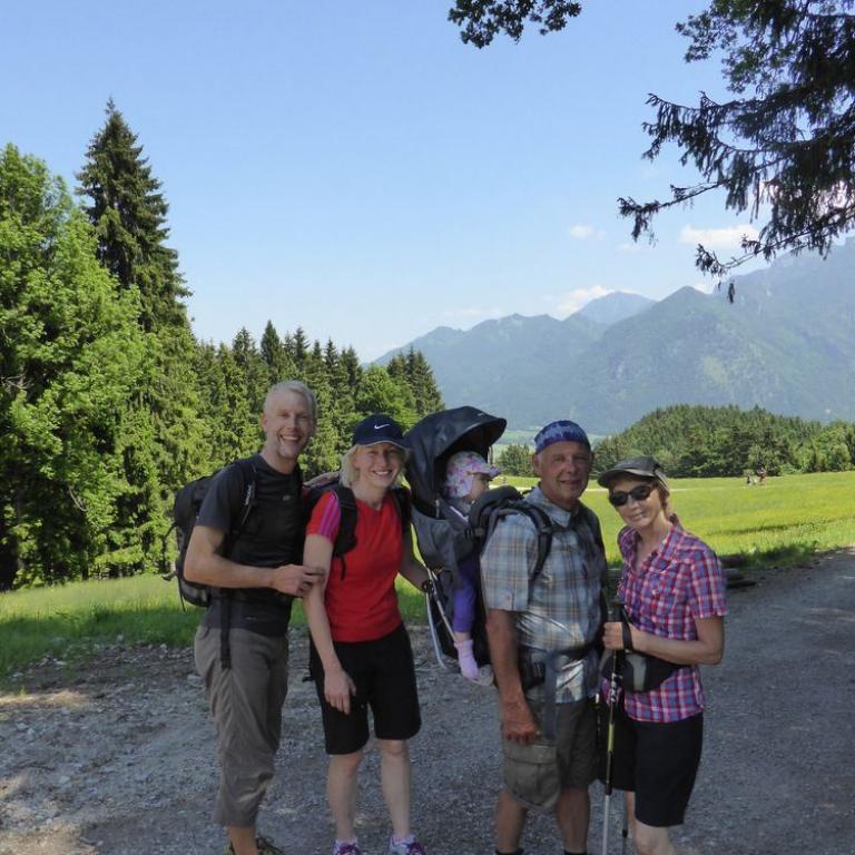 Relativ schnell erreichten wir unsere Unterkunft, den Brandstätter Hof in Grassau. Wir brachten unsere Sachen in das urige Zimmer auf dem Bauernhof und gingen auch gleich in die Ferienwohnung meiner Eltern fast gegenüber. Emma bekam dort ihr Mittagessen und schon konnte es auch losgehen. Mit dem Auto fuhren wir mit Opa und Omi zum ehemaligen Gasthof Strehtrumpf, von wo wir unsere Wanderung bei Traumwetter starteten. Über einen Forstweg wanderten wir zur Hefteralm. Emma verschlief fast alles in der Kraxn. Von dort ging es zur Rachlalm wo wir uns eine Brotzeit und Radler kauften. Emma genoß die Aufmerksamkeit von Opa und Omi und unterhielt natürlich den ganzen Tisch. Nach ausgiebiger Rast wanderten wir weiter und stiegen wieder bis zum Ausgangspunkt ab.