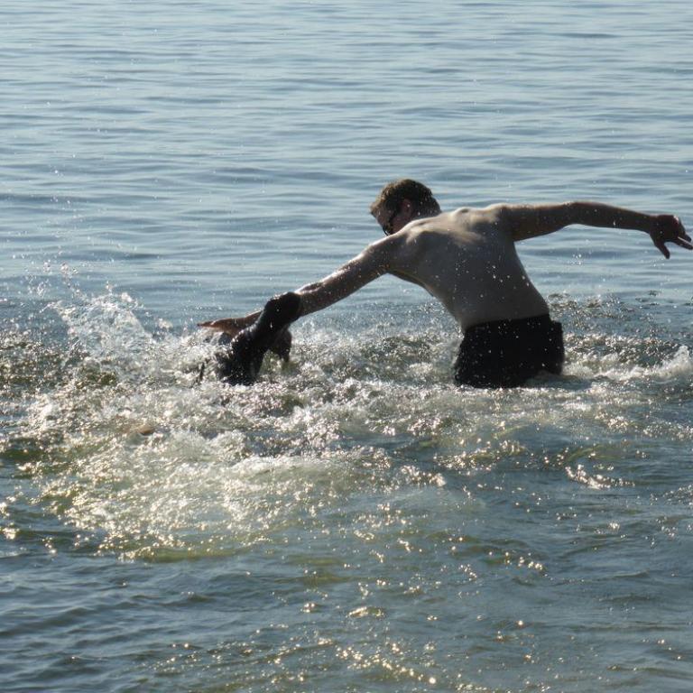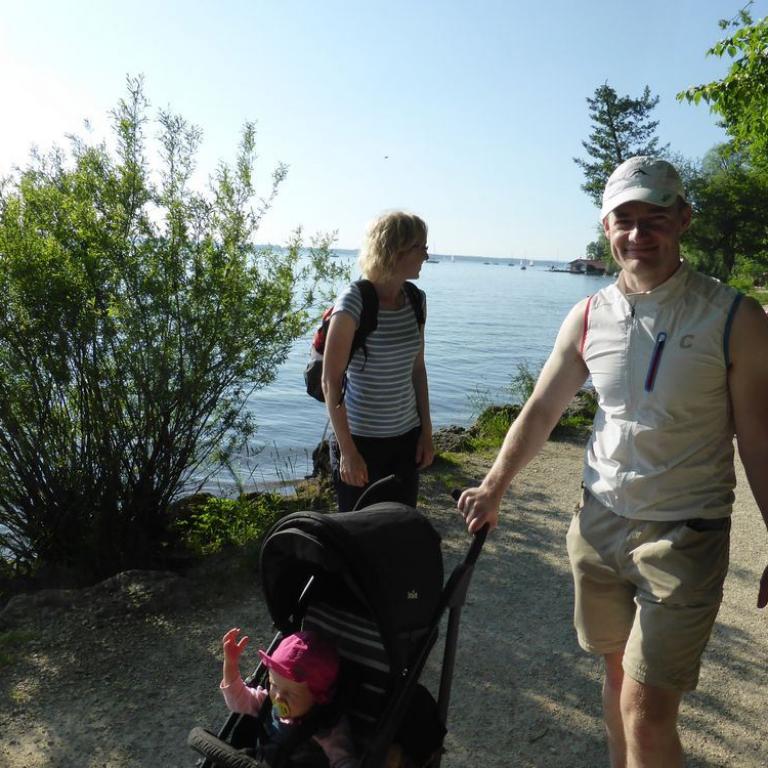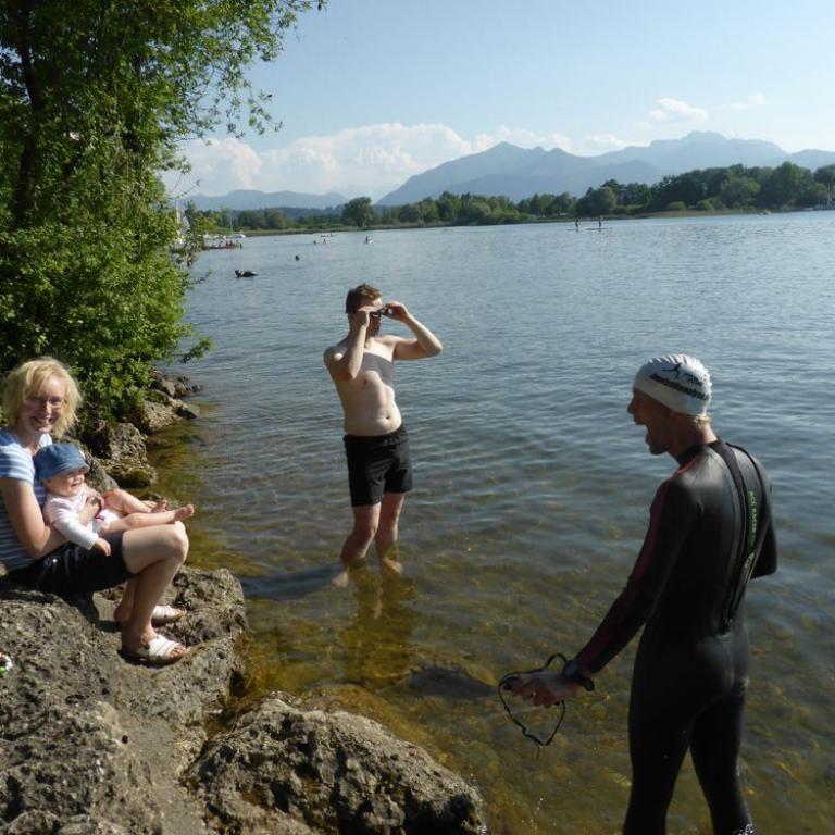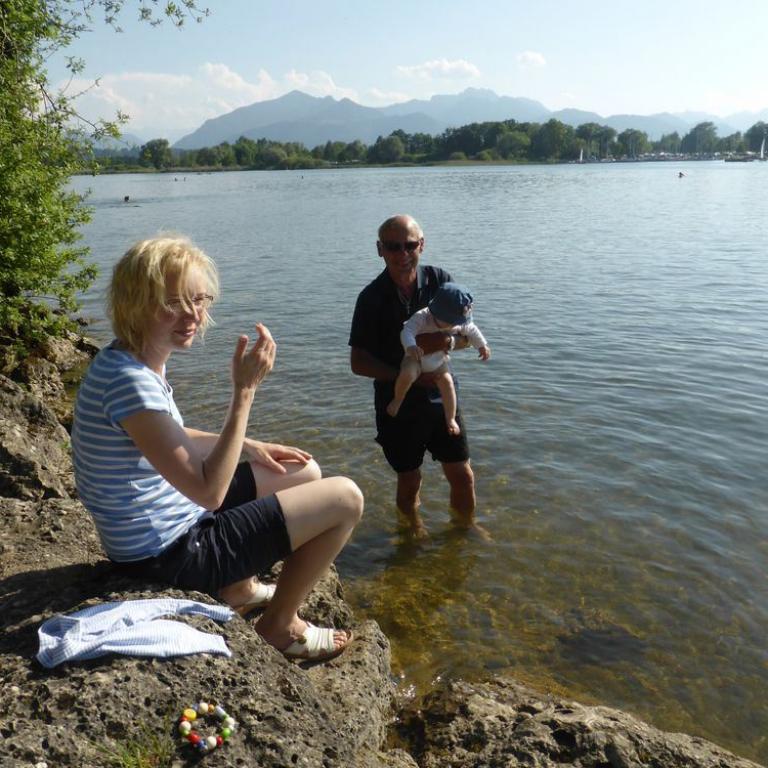 Nach kurzer Rast in der Unterkunft fuhren wir auch gleich wieder weiter mit meinen Eltern an den Chiemsee. Dort trafen wir uns mit den Tichys wo Christoph und ich eine kleine Schwimmeinheit im Chiemsee einlegten. Emma machte unterdessen mit der kleinen Johanna den Spielplatz unsicher. Wir genossen die Sonne und das traumhafte Wetter. Später gingen wir noch in Grassau in eine Pizzeria wo wir Christophs Geburtstag feierten. Erst um 21 Uhr und einem ereignisreichen Tag kam unsere kleine Maus ins Bett. Brigitte und ich genehmigten uns noch ein Gläschen Wein auf dem Balkon, bevor wir müde ins Bett gingen.