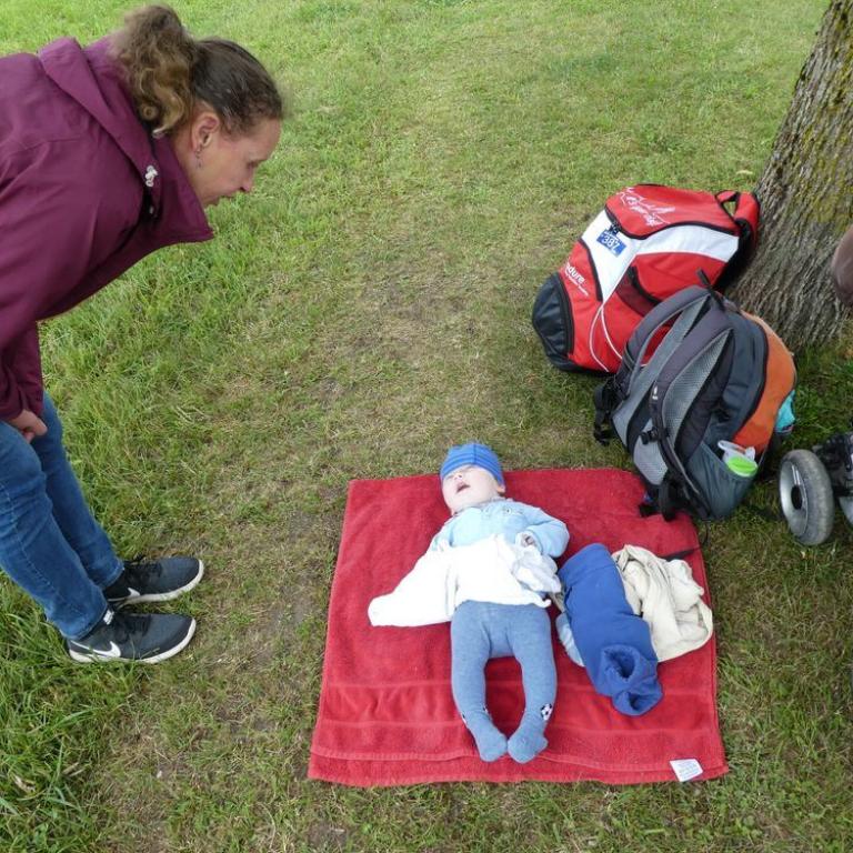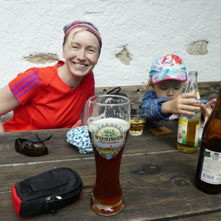 Schon um kurz nach 7 lief ich bei Sonne und blauem Himmel zum Reifinger See, wo ich mit Neo 3,3 km durch das Wasser sauste. Auf dem Rückweg nahm ich noch frische Semmeln und Brot mit. Nach dem Frühstück fuhren wir vier nach Frasdorf bis zum Wanderparkplatz Lederstube. Hier führte uns ein Forstweg leicht ansteigend an einem Bach entlang. Bei der Hälfte der Strecke hatte unser kleiner Zwerg Hunger und wollte sein Fläschchen. Nach knapp 1 1/2 Stunden 3,6 km 360 Höhenmetern erreichten wir die Almwiesen und die Frasdorfer Hütte auf 950 m. Hier gibt es einen kleinen Spielplatz für Emma und einen schönen Ausblick auf die Almen und Berge. Wir aßen eine Kleinigkleit und auch ein Weißbier durfte nicht fehlen. Auf dem Aufstiegsweg wanderten wir wieder zurück. Wieder auf halbem Weg bekam Timi Hunger und das Fläschchen musste her :-)