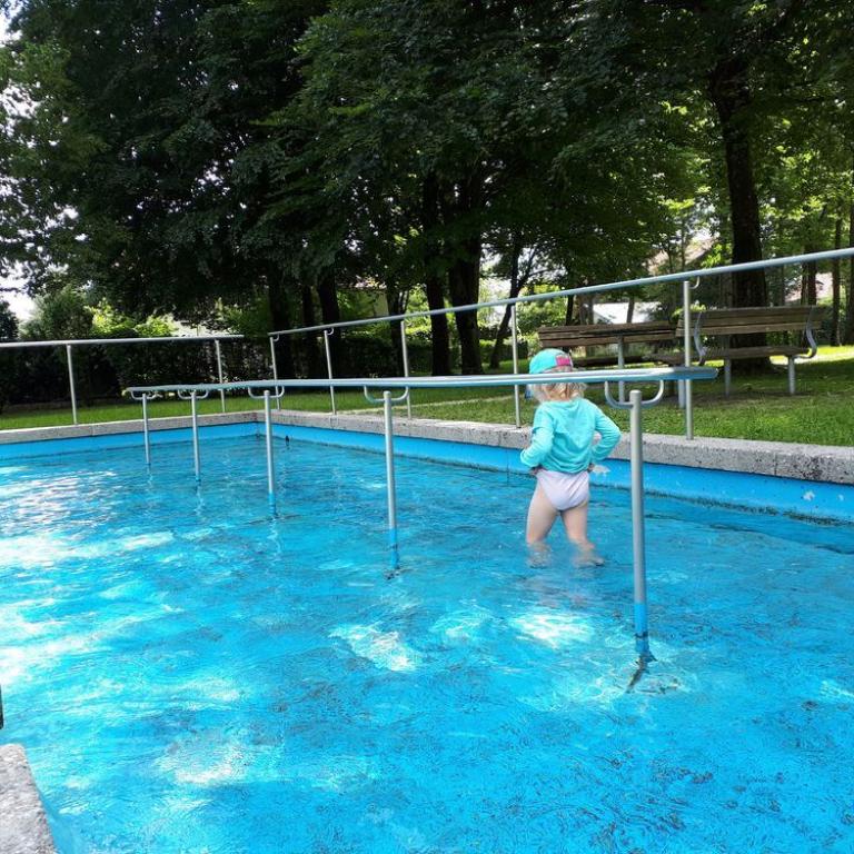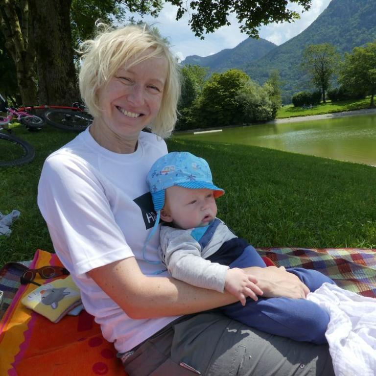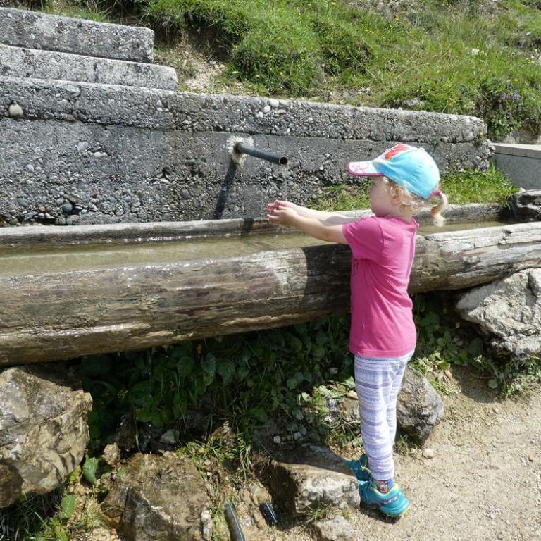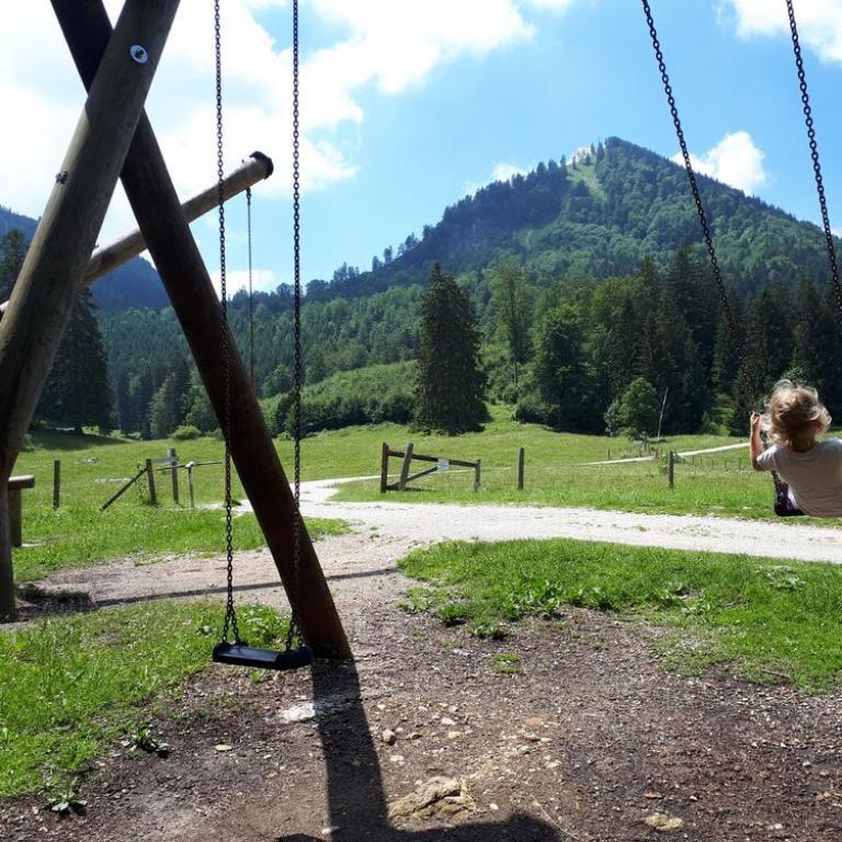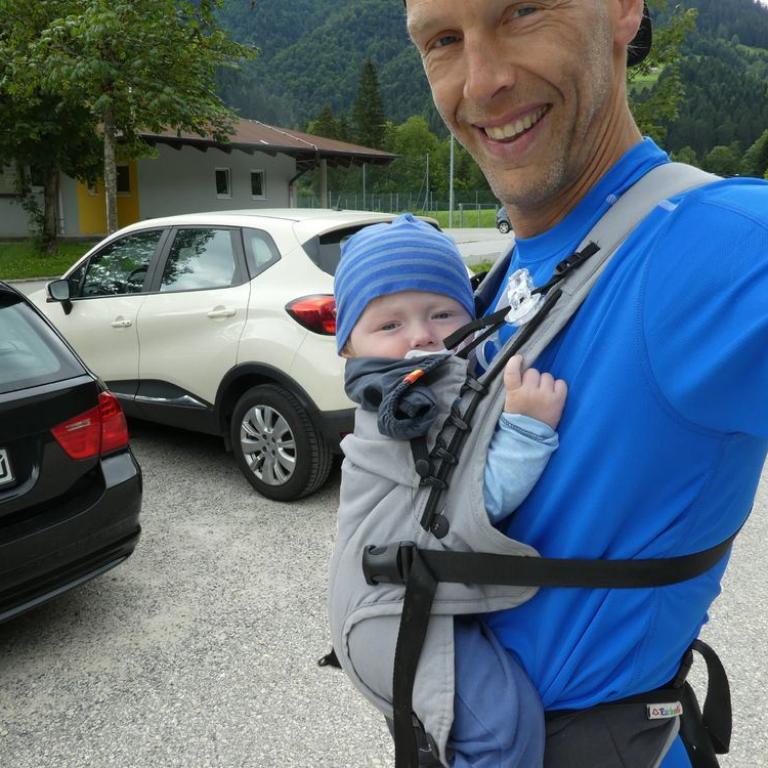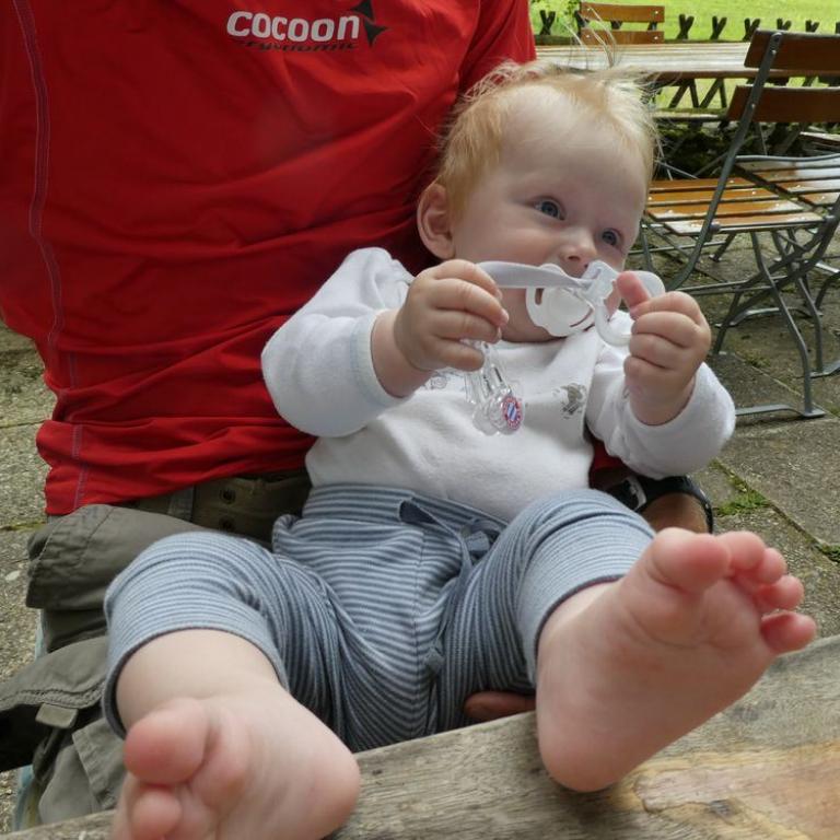 Schon um kurz nach 7 lief ich bei Sonne und blauem Himmel zum Reifinger See, wo ich mit Neo 3,3 km durch das Wasser sauste. Auf dem Rückweg nahm ich noch frische Semmeln und Brot mit. Nach dem Frühstück fuhren wir vier nach Frasdorf bis zum Wanderparkplatz Lederstube. Hier führte uns ein Forstweg leicht ansteigend an einem Bach entlang. Bei der Hälfte der Strecke hatte unser kleiner Zwerg Hunger und wollte sein Fläschchen. Nach knapp 1 1/2 Stunden 3,6 km 360 Höhenmetern erreichten wir die Almwiesen und die Frasdorfer Hütte auf 950 m. Hier gibt es einen kleinen Spielplatz für Emma und einen schönen Ausblick auf die Almen und Berge. Wir aßen eine Kleinigkleit und auch ein Weißbier durfte nicht fehlen. Auf dem Aufstiegsweg wanderten wir wieder zurück. Wieder auf halbem Weg bekam Timi Hunger und das Fläschchen musste her :-)