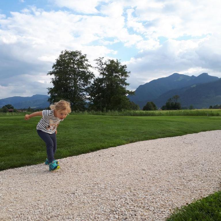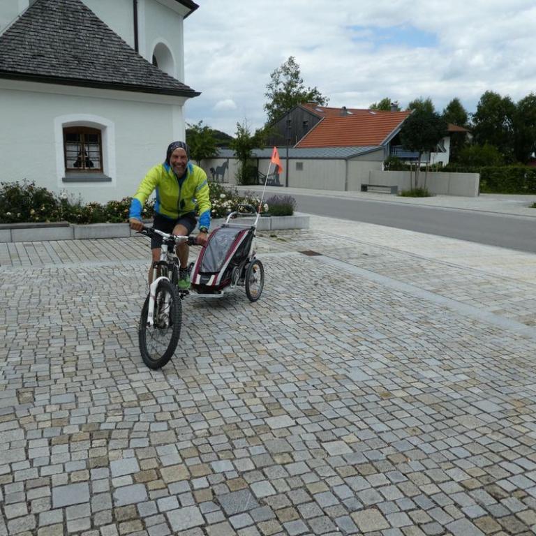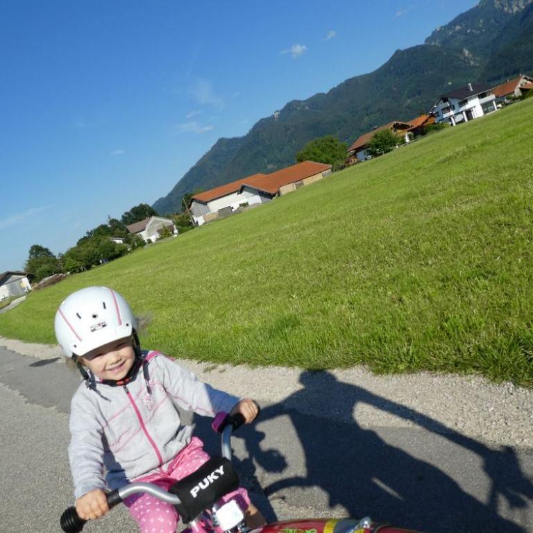 Am Morgen startete Brigitte mit einer Laufeinheit zum Bäcker und die Zwerge und ich legten eine Rumpfstabi und Frühstückherrichteinheit ein. Später ballerte ich mit dem Tribike los. Einmal um den Chiemsee, dem bayerischen Meer. Für die 60 Kilometer benötigte ich 1h 51 min. Dann machte ich noch die Umgebung von Grassau unsicher und kam auf knappe 100 km. Am Nachmittag fuhren wir in das Spieleparadies Babalu bei Traunstein. Emma und auch Papa und Mama sausten durch die Parcours. Zuhause testeten Emma und ich eine Abschleppstange fürs Kinderrad. Befestigt am Mountainbike sausten wir über den Grassauer Golfplatz und genossen die Sonne und das schöne Abendwetter, bevor wir dann den Abend bei einer "gscheitn" Brotzeit ausklingen ließen.