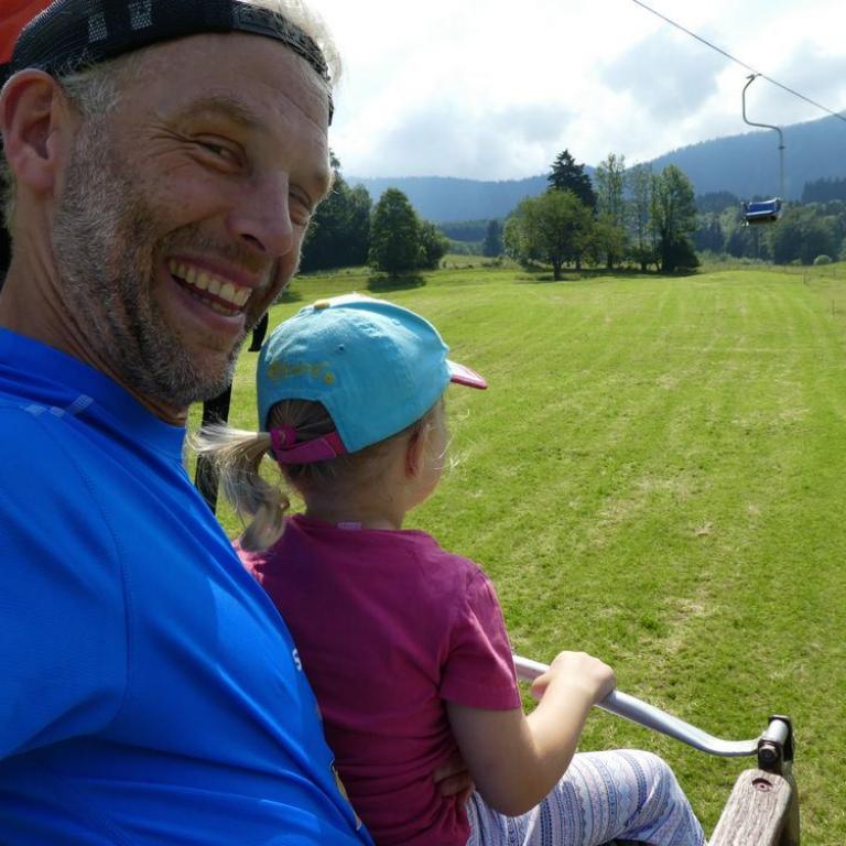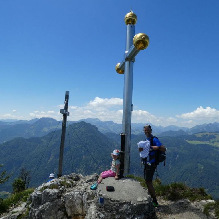 Brigitte legte eine Morgenlaufeinheit und Semmelholeinheit und ich eine Rumpfstabi und Open Water Neo Swimeinheit im Reifinger See ein. So konnte schon mal der Tag beginnen :-) Nach dem Frühstück fuhren wir nach Samerberg/Grainbach bei Frasdorf. Hier fuhren wir mit dem Sessellift zur Hochriesmittelstation. Emma durfte auf meinem Schoß fahren und war begeistert. Ab hier ging dann die Gondel bis knapp unter dem Gipfel. Eigentlich sind wir ja die Gipfelbesteiger und halten nicht viel vom Gondelfahren, aber heute wollten wir einen weiteren Gipfel neben dem Hochries besteigen und nach unten wandern. Der Hochriesgipfel 1568 m war gut besucht und viele Gleitschirmflieger tummelten sich an den Abflugplätzen. Ein nicht ganz einfacher Steig führte uns westlich des Gipfels nach unten um dann auf den Karkopf 1496 m wieder anzusteigen. Meine kleine Emma kletterte tapfer über die Steine und hinauf zum Gipfel. Hier bekam Timi sein Fläschchen und Emma ihre wohlverdiente Brotzeit :-) Wir stiegen dann bis zur Mooserbodenalm auf 950 Hm ab. Hier kehrten wir in der kleinen und gemütlichen Alm ein. Es gab Suppe, Kuchen und Radler. Da wir schon 2 1/2 Stunden gewandert waren, entschieden wir ab der Mittelstation wieder mit dem Sessellift ins Tal zu fahren. Hier stieg ich auf mein Tribike das wir im Auto mit dabei hatten und düste los. Ich legte noch eine 80 km Runde ein, bevor ich wieder in Grassau ankam, wo ich mit Emma Fußball spielte und mit Brigitte am Balkon den Abend bei einem Film und Bierchen ausklingen ließ.