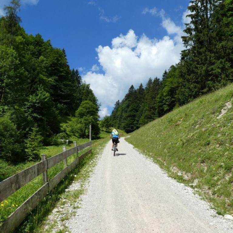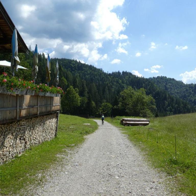 Direkt zum Frühstück kamen heute Opa und Omi, um unsere Zwerge zu besuchen. Emma und Timi freuten sich sehr, ihre Omi und ihren Opa zu sehen. Die Vier fuhren zum Baden an den Chiemsee und genossen den Tag. Brigitte und ich nutzten die Zeit für sportliche Aktivitäten. Wir fuhren mit dem MTB nach Oberwössen und von dort eine steile Forststraße zur Hutzenalm auf 990 m. Von hier bretterten wir nach Reit im Winkl hinunter, wo wir uns einen Kuchen und Radler als Stärkung genehmigten.