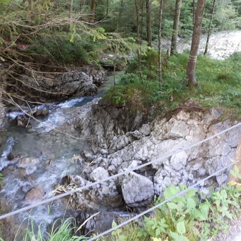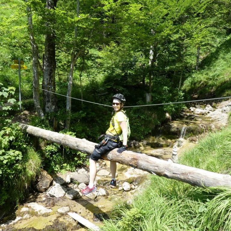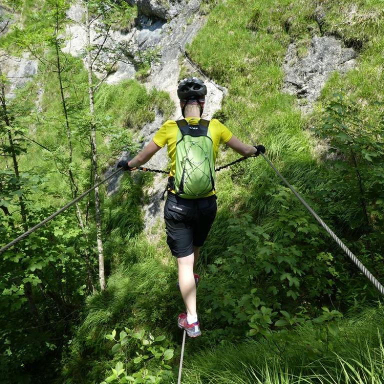 Nach der Stärkung fuhren wir zum Einstieg des Hausbachfall Klettersteigs: Eine Schlucht mit schönen Wasserfällen und steil abbrechenden Felswänden in unmittelbarer Nähe vom Ortszentrum bessere Gegebenheiten gibt es für einen Talklettersteig wohl kaum. Die sogar TÜV geprüfte Tour ist ein schöner Genussklettersteig am Alpenrand. Immer an der rechten Klammseite turnt man über Baumstammpassagen und Seilbrücken höher bis man am Ende wieder auf die linke Bachseite zum Abstiegsweg balanciert. Der kurze, aber doch pfiffige Klettersteig machte uns viel Spaß. Nach 45 Minuten standen wir aber schon wieder bei den MTB`s.