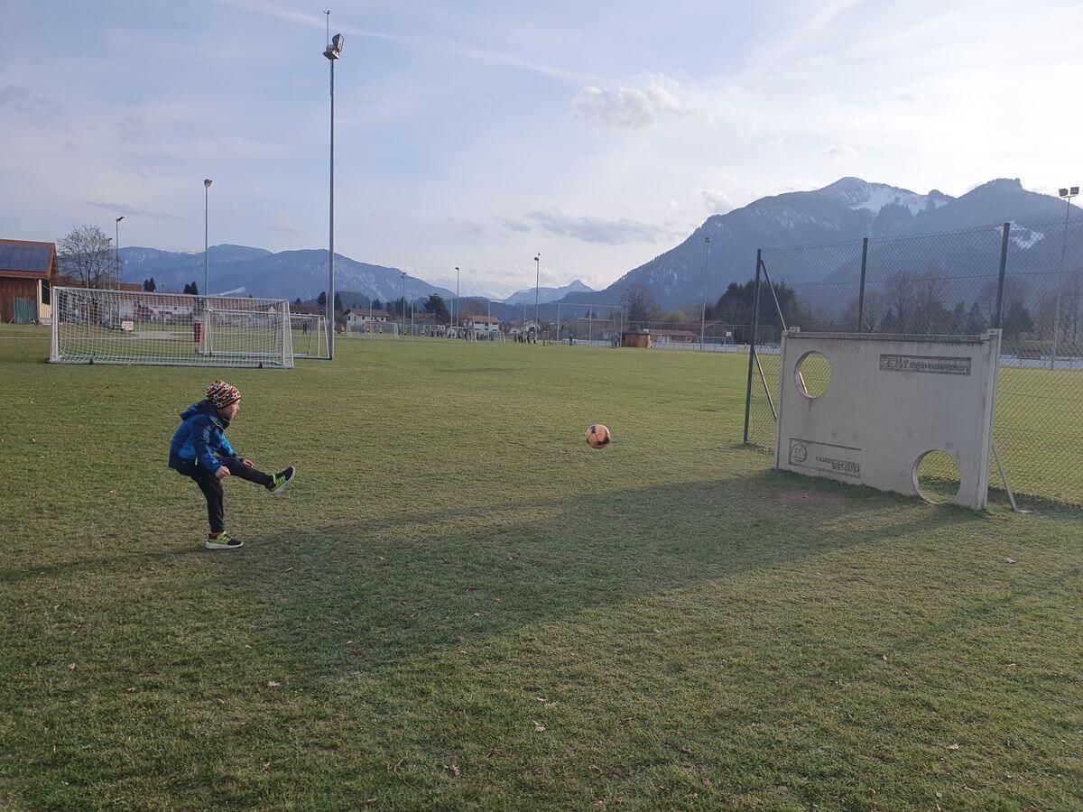 Nach den vielen Pistenkilometern waren wir dennoch noch nicht ausgelastet. Wir fuhren kurz zum Reifinger See, wo ich meine Füße ins eisige Wasser hielt. Im Anschluss spielten wir auf dem Grassauer Fußballplatz noch eine Runde Fußball. Nach einer ausgiebigen Dusche in der Ferienwohnung marschierten wir zu unserer Stammpizzeria Da Pino, wo wir leckere Nudeln aßen und ich Timi das „Watten“ beibrachte. Zurück in der Wohnung schauten wir noch einen Superheldenfilm („Guardians of the Galaxy“), bevor wir müde die Augen schlossen.
