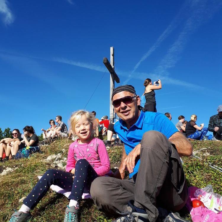 Auch heute hatten wir wieder traumhaftes Bergwetter. Nach dem Frühstück fuhren wir mit Opa zum Hochplattenlift in Marquartstein. Mit dem alten Sessellift gelangten wir zur Bergstation auf knapp über 1040 Hm. Von hier wanderten wir zuerst durch den Wald, bis wir immer wieder eine schöne Aussicht auf Grassau, Hochgern und den Chiemsee hatten. Weiter oben erreichten wir eine kleine Alm. Hier fanden wir einen schmalen Trail der nach links von der Forststraße abzweigte. Laut meiner Locus Map App sollte dieser Weg bis direkt unterhalb des Gipfels führen. Emma war unsere Pfadfinderin und ging voraus. Hinten nach wanderte noch eine Familie. Emma suchte stolz den Weg und führte uns durch Latschen nach oben, bis wir den vielbesuchten Gipfel erreichten. Knapp 600 Höhenmeter schaffte meine kleine Maus. Stolz stand sie am Gipfel und freute sich über ihren 157. Gipfelsieg :-) Wir genossen eine kleine Brotzeit und vor allem den traumhaften Ausblick, bevor wir über den Normalweg abstiegen. Emma war begeistert von den kurzen Kletterstellen bis zur Hochplattenscharte. Ab hier wanderten wir auf dem Forstweg zurück bis zur Staffnalm, die restlos überfüllt war. Wir fanden noch einen Platz und ließen uns die Radler und Käse und Würstl schmecken :-). Danach fuhren wir mit der Sesselbahn zurück zum Tal. Opa fuhr mit Emma im Auto nach Grassau und ich legte einen 5 km Tempolauf, ebenfalls zurück zur Wohnung, in 19:15 Minuten ein. In Grassau packten wir unsere Sachen ins Auto und Emma und ich machten uns wieder auf die Heimreise