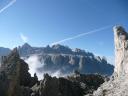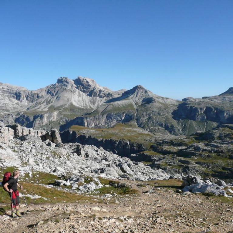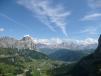 Die ersten 400 Höhenmeter waren auf dem Crespeina Joch geschafft. Von hier hatten wir einen herrlichen Ausblick zurück zur Puezhütte und weiter zu den Cir Spitzen, die ich vor Jahren schon bestiegen hatte. Zuerst wanderten wir über Holztritte abwärts, bevor es wieder zum Cirjoch nach oben ging. Am Cir Joch 2462 m hatten wir eine atemberaubende Aussicht auf den Pz Boe, das Grödnerjoch und die Berge im Osten. Von hier ging es nun steil über Serpentinen abwärts.