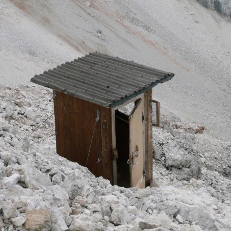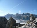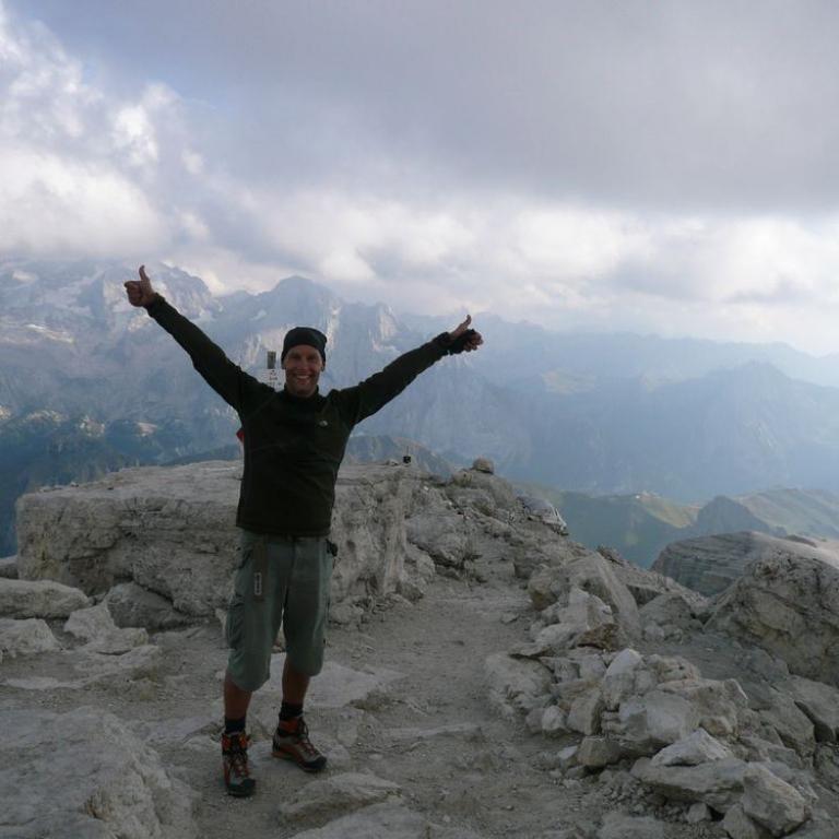 Die Rucksäcke ließen wir auf der Hütte. Nur der Gipfelschnaps musste mit. 280 Höhenmeter stiegen wir steil nach oben auf unseren ersten Dreitausender auf der Tour. Nach ca. einer halben Stunde erreichten wir den Gipfel, wo eine Hütte steht und von wo wir einen herrlichen Rundumblick hatten. Vor uns die Königin der Dolomiten, die Marmolada und viele Dreitausender rechts und links von uns. Wir hielten uns nicht zu lange, da ja das Abendessen auf uns wartete.