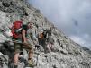 Zuerst mussten wir bis zum Grödner Joch auf 2121 m absteigen, bevor wir den Gegenanstieg starteten. Bis zum Einstieg des Klettersteiges benötigten wir ca. 1/2 Stunde. Den Klettersteig bin ich 2008 schon mal gegangen und auch damals war ich sehr begeistert. Er hat den Schwierigkeitsgrad C und ist auch für Kinder geeignet. Die Aussicht vom Steig ist herrlich. Wir zogen unsere Klettersteigausrüstung an. Mit Helm und Gurt bewaffnet starteten wir den Aufstieg zur Pisciadu Hütte auf 2585 m . Nach ca. 2 1/2 Stunden im Steig, einer Hängebrücke, vielen senkrechten Wänden erreichten wir den Austieg.