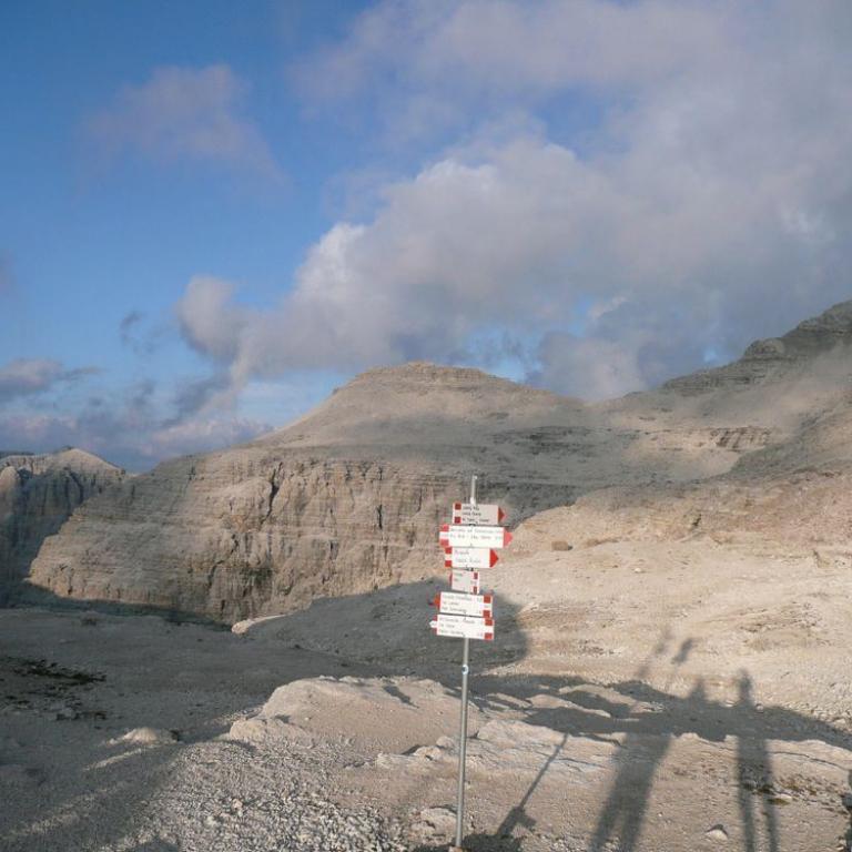 Hier ging wieder die Zivilisation los, Tausende Wanderer und auch Nichwanderer kamen uns entgegen. Am Grödner Joch kehrten wir erstmal zum zweiten Frühstück ein. Natürlich gab es ein Weißbier und Kaffee. Nach kurzer Pause starteten wir die Wanderung zum Pisciadu Klettersteig.