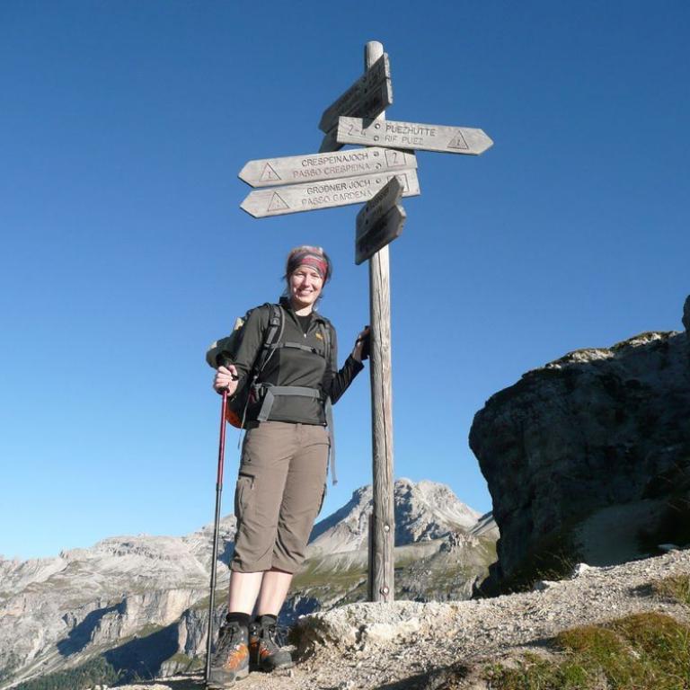 Um halb 7 gab es Frühstück auf der Puezhütte. Brot, Marmelade und Kaffee bzw. Tee. Draussen war es ganz schön eisig, aber der Himmel war blau und die Sonne schaute schon um die Berge herum. Wir wanderten zuerst um das Langental bis zum Ciampeijoch auf 2366 m und dann weiter zum Crespeina Joch auf 2528 m. In der Sonne war es auch gleich herrlich war und die Wege gehörten nur uns. Kein Mensch war schon um diese Zeit unterwegs, was sich später aber ändern würde.
