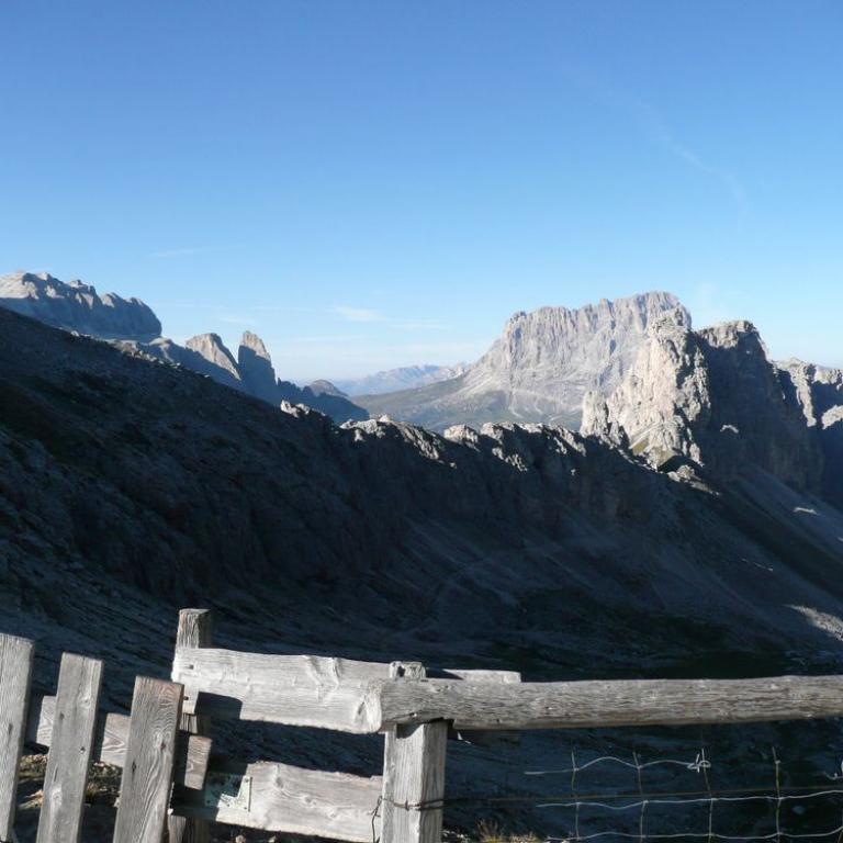 Die ersten 400 Höhenmeter waren auf dem Crespeina Joch geschafft. Von hier hatten wir einen herrlichen Ausblick zurück zur Puezhütte und weiter zu den Cir Spitzen, die ich vor Jahren schon bestiegen hatte. Zuerst wanderten wir über Holztritte abwärts, bevor es wieder zum Cirjoch nach oben ging. Am Cir Joch 2462 m hatten wir eine atemberaubende Aussicht auf den Pz Boe, das Grödnerjoch und die Berge im Osten. Von hier ging es nun steil über Serpentinen abwärts.
