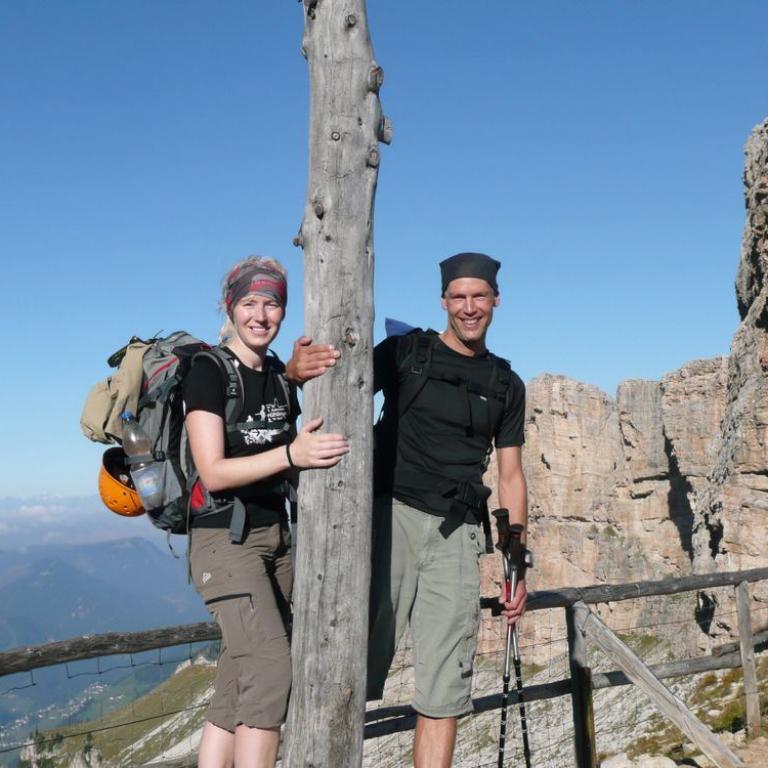 Vom Austieg waren es noch ca. 20 min bis zur Hütte. Die Aussicht war gigantisch, aber in der Sonne kamen wir schon ganz schön ins Schwitzen. Auf der Hütte gabs zur Stärkung natürlich wieder ein Weißbier. Viele Wanderer und Kletterer versammelten sich auf der Hütte. Nach kurzer Rast starteten wir auch schon den nächsten Aufstieg.