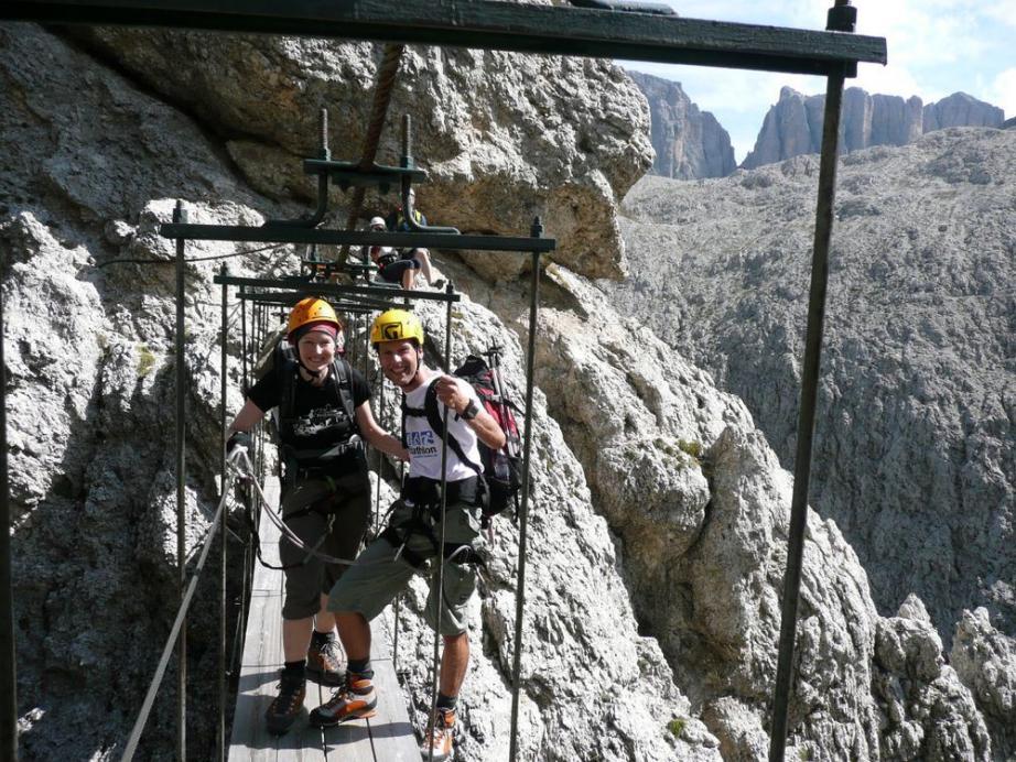 Zuerst mussten wir bis zum Grödner Joch auf 2121 m absteigen, bevor wir den Gegenanstieg starteten. Bis zum Einstieg des Klettersteiges benötigten wir ca. 1/2 Stunde. Den Klettersteig bin ich 2008 schon mal gegangen und auch damals war ich sehr begeistert. Er hat den Schwierigkeitsgrad C und ist auch für Kinder geeignet. Die Aussicht vom Steig ist herrlich. Wir zogen unsere Klettersteigausrüstung an. Mit Helm und Gurt bewaffnet starteten wir den Aufstieg zur Pisciadu Hütte auf 2585 m . Nach ca. 2 1/2 Stunden im Steig, einer Hängebrücke, vielen senkrechten Wänden erreichten wir den Austieg.