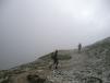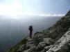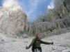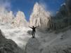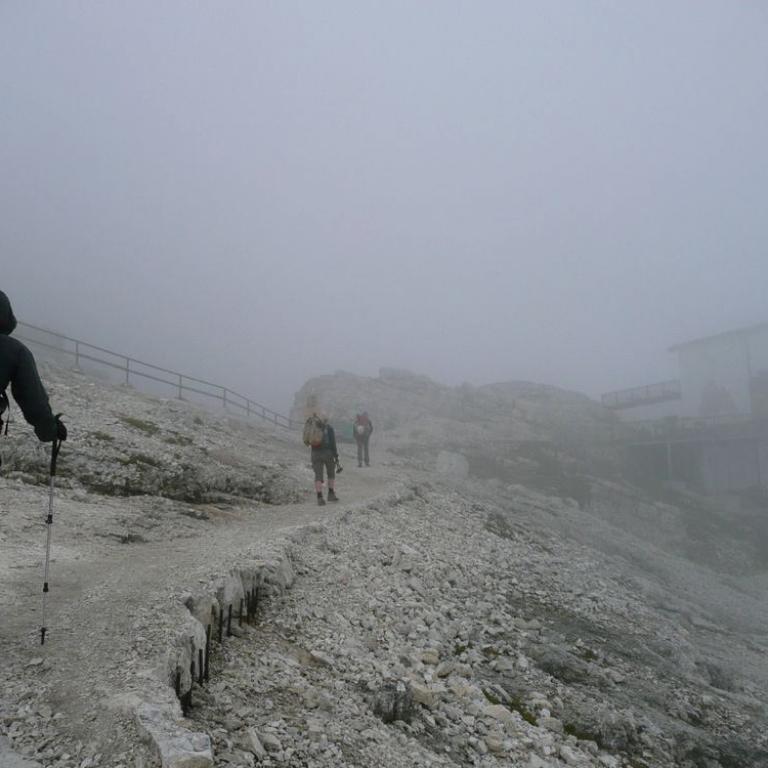 Dann ging es weiter an der Ostseite der nördlichen Palagruppe entlang. Hier war absolute Schwindlfreiheit und Trittsicherheit gefragt. Immer wieder gab es Kletterstellen im 1. Schwierigkeitsgrad. Unter uns liegt das Tal Valle Delle Comelle und ober uns einer der schwierigsten Klettertürme der Dolomiten, des Torcia di Val Grande. Ich zog mir am Finger eine kleine Schnittverletzung dank der rostigen Stahlseile zu. Aber dies gehört auch dazu. Durch ein herrliches Tal gelangten wir zum nächsten Anstieg. Über Felsplatten ging es steil nach oben. Hier hielt sich der Nebel ziemlich hartnäckig. Auch der Wind wurde immer eisiger, aber wir hatten unser Ziel das Rifugio Rosetta erreicht. Hier gab es ein leckeres Mittagessen und ein Siegerweißbier. Von der Hütte waren es nur noch ein paar Minuten zur Bergstation der Seilbahn nach San Martino di Castrozza.