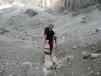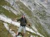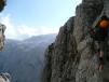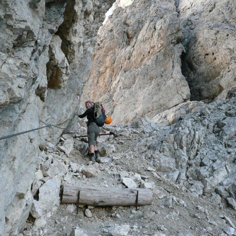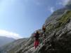 Über Geröll und Stahltritte mussten wir abwärts in eine Schlucht. Von hier ging der Weg an herrliche Felsen entlang. Unter uns liegt das Tal Val Grande. Der Weg führte uns an steilen Hängen weiter. Rechts ging es steil nach oben und links steil nach unten. Wir mussten sehr vorsichtig gehen, da der Weg nur sehr schmal war. An den schwierigsten Stellen waren Stahlseile gespannt, damit man ein wenig Halt hatte. Eine Abzweigung führt zur Biwak Schachtel Brunner auf 2665 m.