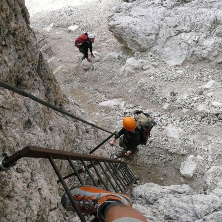Heute stand unser letzter Tourabschnitt auf dem Programm. Nach dem Frühstück starteten wir den Aufstieg vom Rifugio Mulaz zum Paso delle Farangole. In steilen Serpentinen kämpften wir uns gleich nach oben. Der Wind pfiff eisig durch die Scharte. Immer wieder war der Weg Stahlseilversichert, bis es dann über eine Art Klettersteig, wo der Helm dringend erforderlich war, nach oben zum Pass ging. Leichte Kletterei im 1. Schwierigkeitsgrad war angesagt. Manche Tritte hatten leider auch schon bessere Zeiten gesehen.