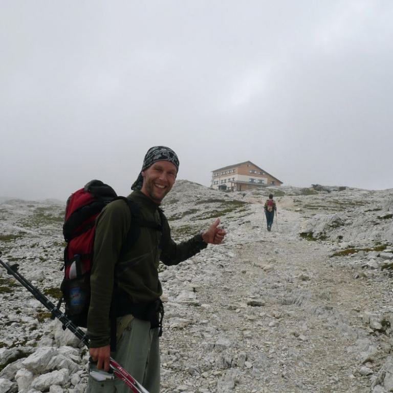 Dann ging es weiter an der Ostseite der nördlichen Palagruppe entlang. Hier war absolute Schwindlfreiheit und Trittsicherheit gefragt. Immer wieder gab es Kletterstellen im 1. Schwierigkeitsgrad. Unter uns liegt das Tal Valle Delle Comelle und ober uns einer der schwierigsten Klettertürme der Dolomiten, des Torcia di Val Grande. Ich zog mir am Finger eine kleine Schnittverletzung dank der rostigen Stahlseile zu. Aber dies gehört auch dazu. Durch ein herrliches Tal gelangten wir zum nächsten Anstieg. Über Felsplatten ging es steil nach oben. Hier hielt sich der Nebel ziemlich hartnäckig. Auch der Wind wurde immer eisiger, aber wir hatten unser Ziel das Rifugio Rosetta erreicht. Hier gab es ein leckeres Mittagessen und ein Siegerweißbier. Von der Hütte waren es nur noch ein paar Minuten zur Bergstation der Seilbahn nach San Martino di Castrozza.